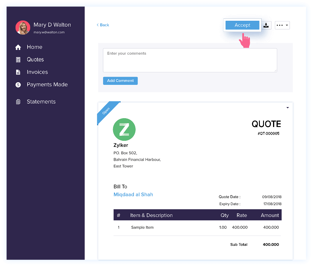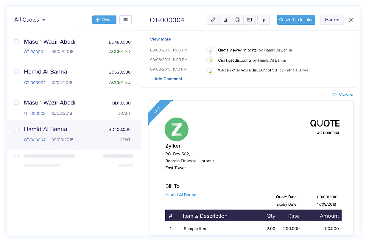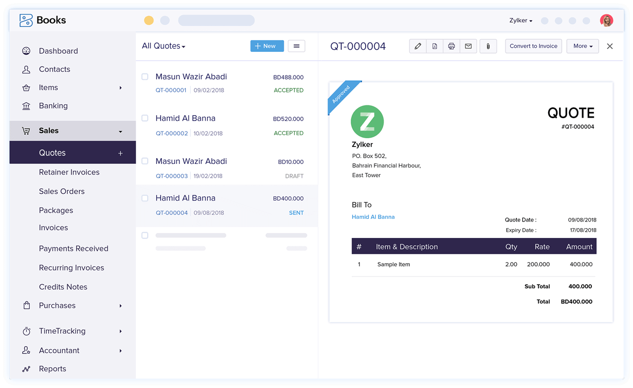 From initial enquiry to final approval, streamline your sales process with professional quotes. Zoho Books helps you create a quote, send it to your customer, track its status, and convert it into an invoice — without switching tools.