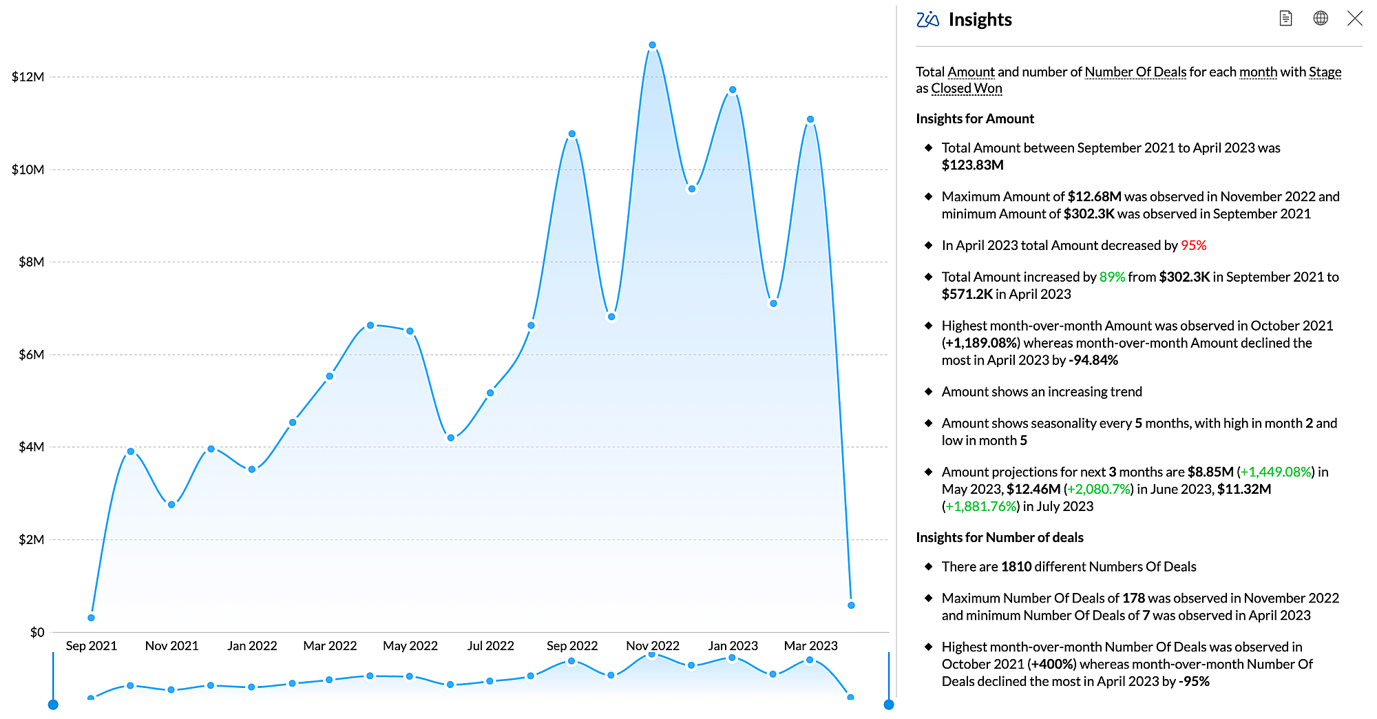 In addition, Zoho Analytics supports 50+ visualization options, helps you extract meaningful insights, and much more. With the help of modern technologies such as AI, ML, and NLP/G, Zoho Analytics has made deriving insights simple. Get automated AI insights and converse in natural language to generate reports and charts. Here's an example: