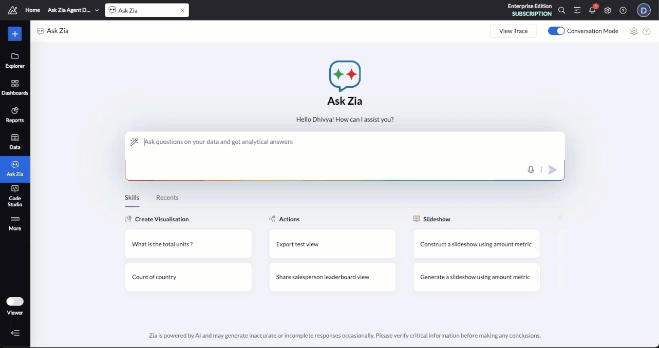 - Embed Ask Zia Anywhere: Ask questions, explore data, detect patterns or anomalies, and identify the key factors driving the metrics without switching platforms. Ask Zia is context aware, and insights are provided based on the user's role, data context, and access permissions.
