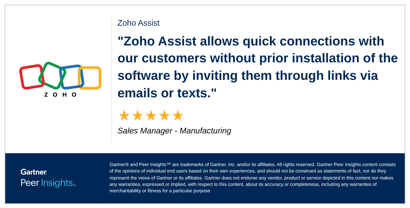 Sales Manager in the Manufacturing Industry gives Zoho Assist 5/5 Rating in Gartner Peer Insights™ Remote Desktop Software Market. Read the full review here: https://gtnr.io/1FPAXe7Xw