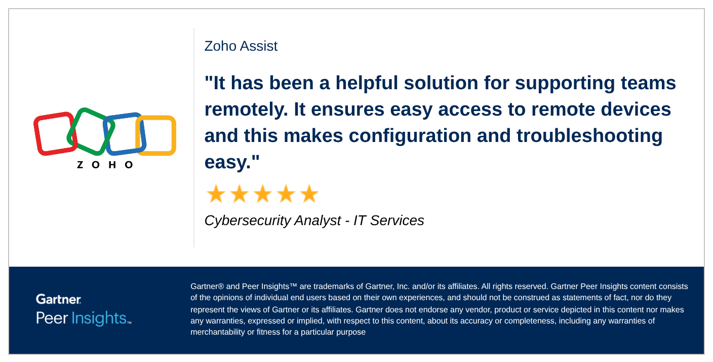 Cybersecurity Analyst in the IT Services Industry gives Zoho Assist 5/5 Rating in Gartner Peer Insights™ Remote Desktop Software Market. Read the full review here: https://gtnr.io/HU5WQ585h