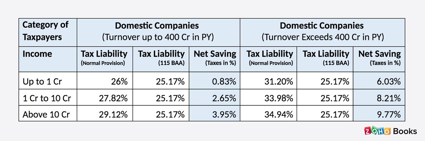 The tax rate under section 115JB of the Act has been reduced from 18.5% to 15%. The net tax savings for domestic companies that continue to pay taxes as per the First Schedule to the Finance (No. 2) Act, 2019 can be seen in the following table, which is divided into categories based on the company’s amount of book profits: