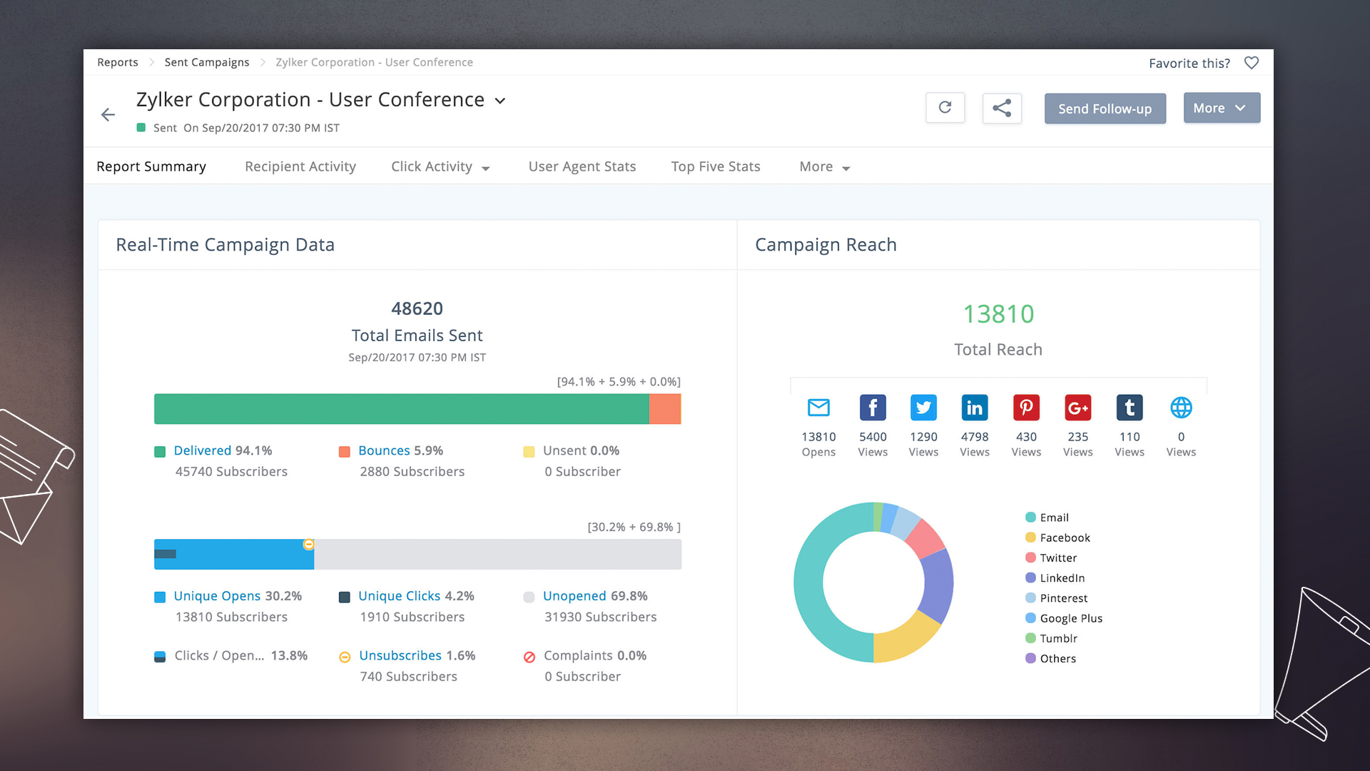 Performance reports are most effective when they guide your actions to increase conversions. Whether it is your mailing list health or subscriber engagement, now you see detailed reports at every level of a campaign. Once your campaigns are running, the customizable dashboard shows you a summary of your email marketing performance.