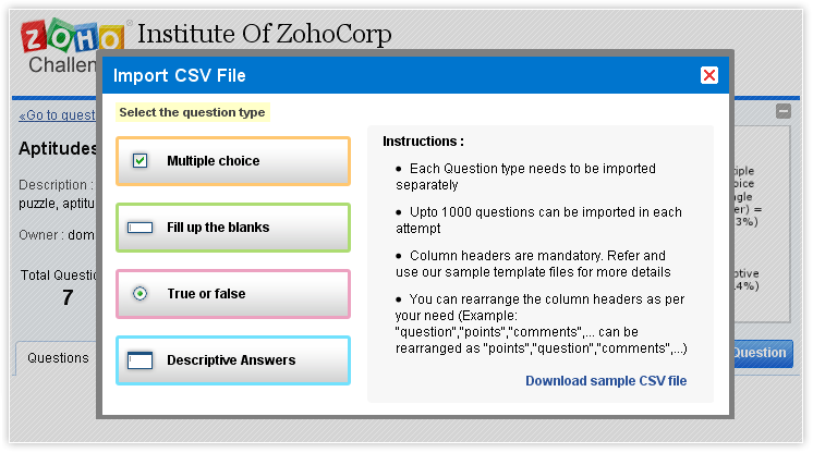 To begin with, we have answered the oft repeated query - "How do I import questions into question banks"? Zoho Challenge now supports a "bulk question import" feature. Using this feature, you can now import CSV or MS Excel (xls) files containing your questions directly into the question bank of your choice.