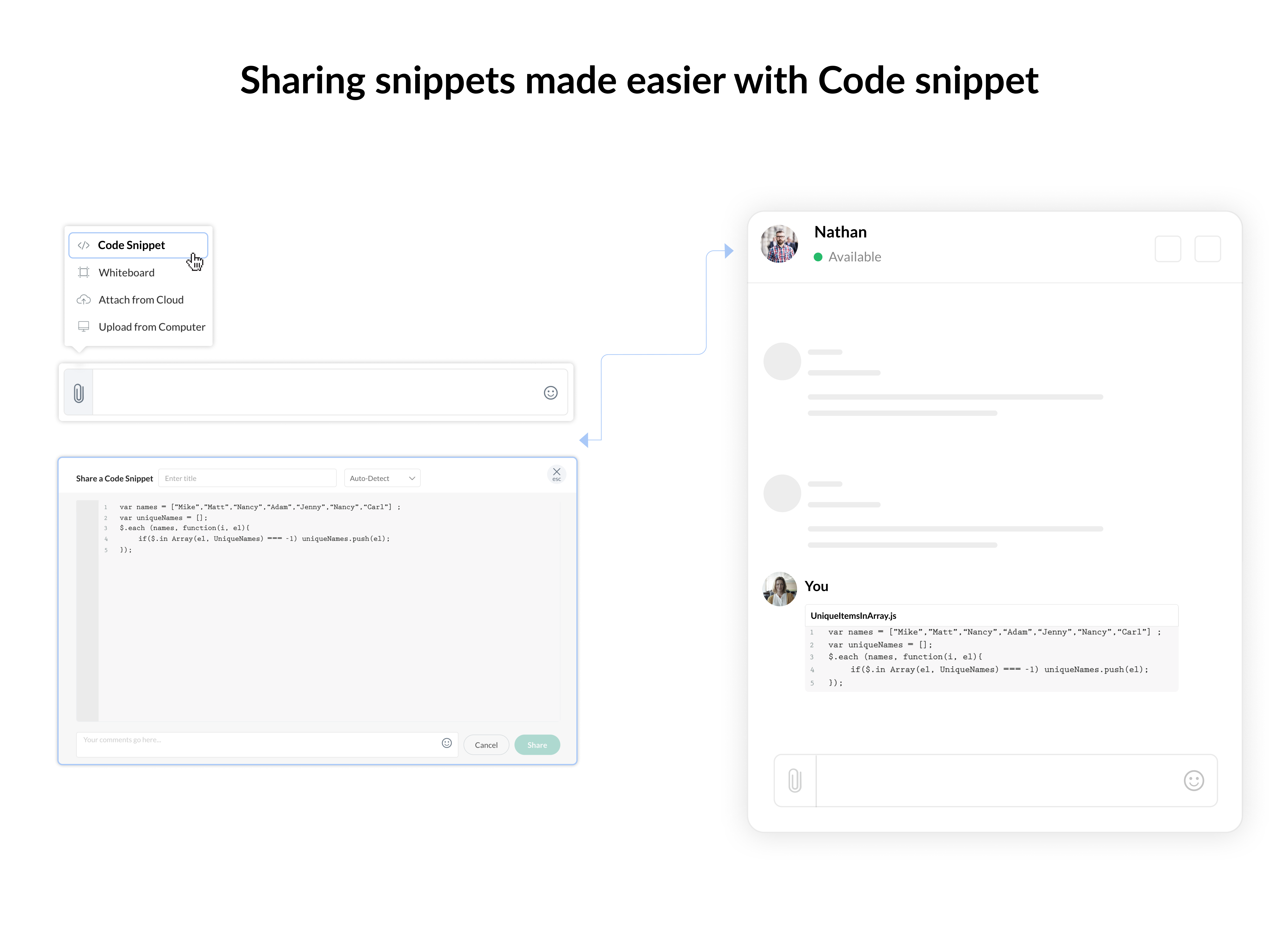 For instance, if you want to share a piece of code without disrupting its format or want to leave comments on a piece of code, select the code snippet option under Attachments and paste the code. Cliq will auto-detect the programming language of the snippet for you. Enter any comments and click Share.