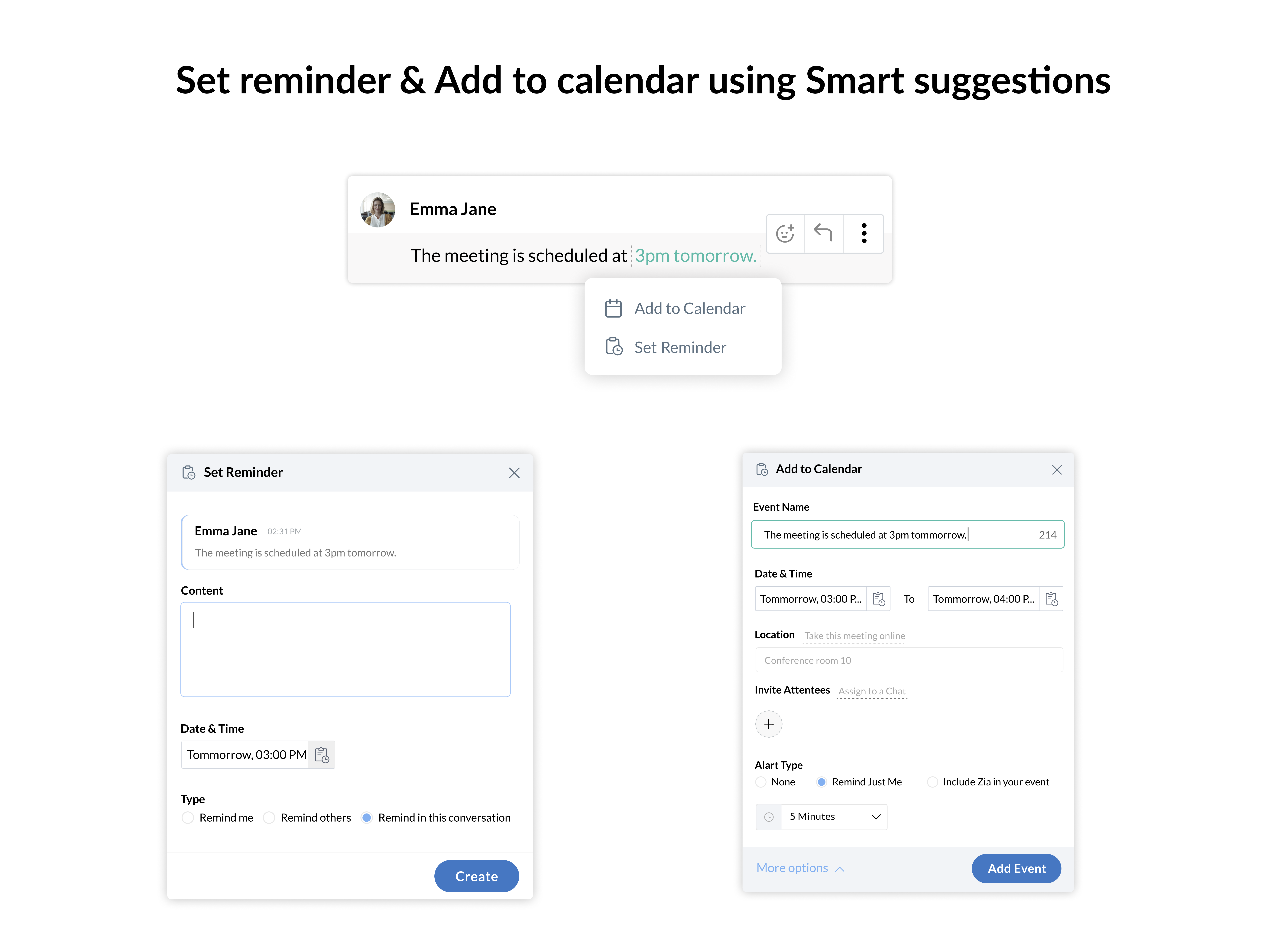 For instance, let's say that your team member sends you a message saying there is a submission due tomorrow. Cliq can detect time and dates in a conversation and it will highlight the word "tomorrow." Hover over it to see an option to Add to calendar or Set as reminder.