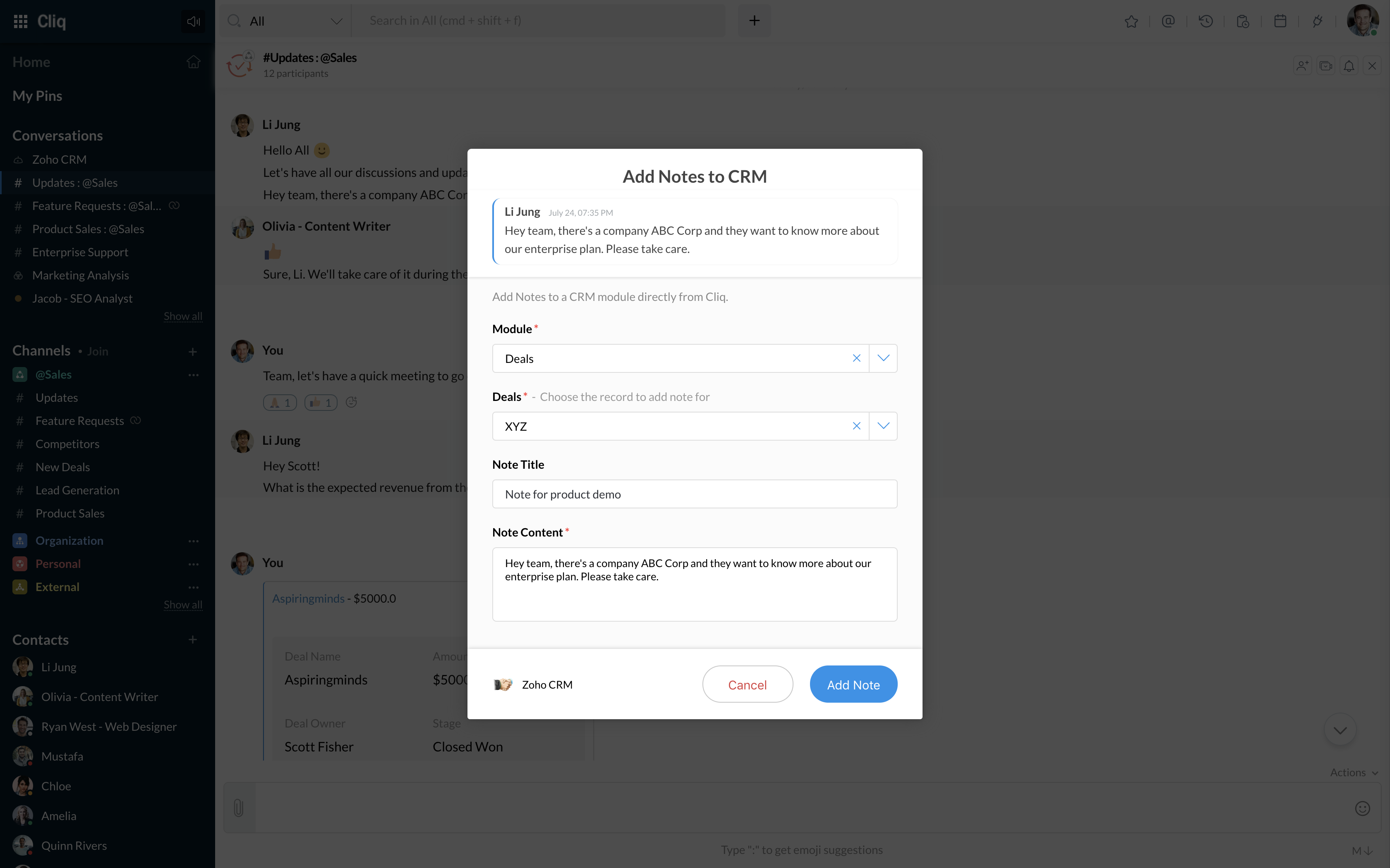 Boost your sales by using Zoho Cliq's integration with Zoho CRM