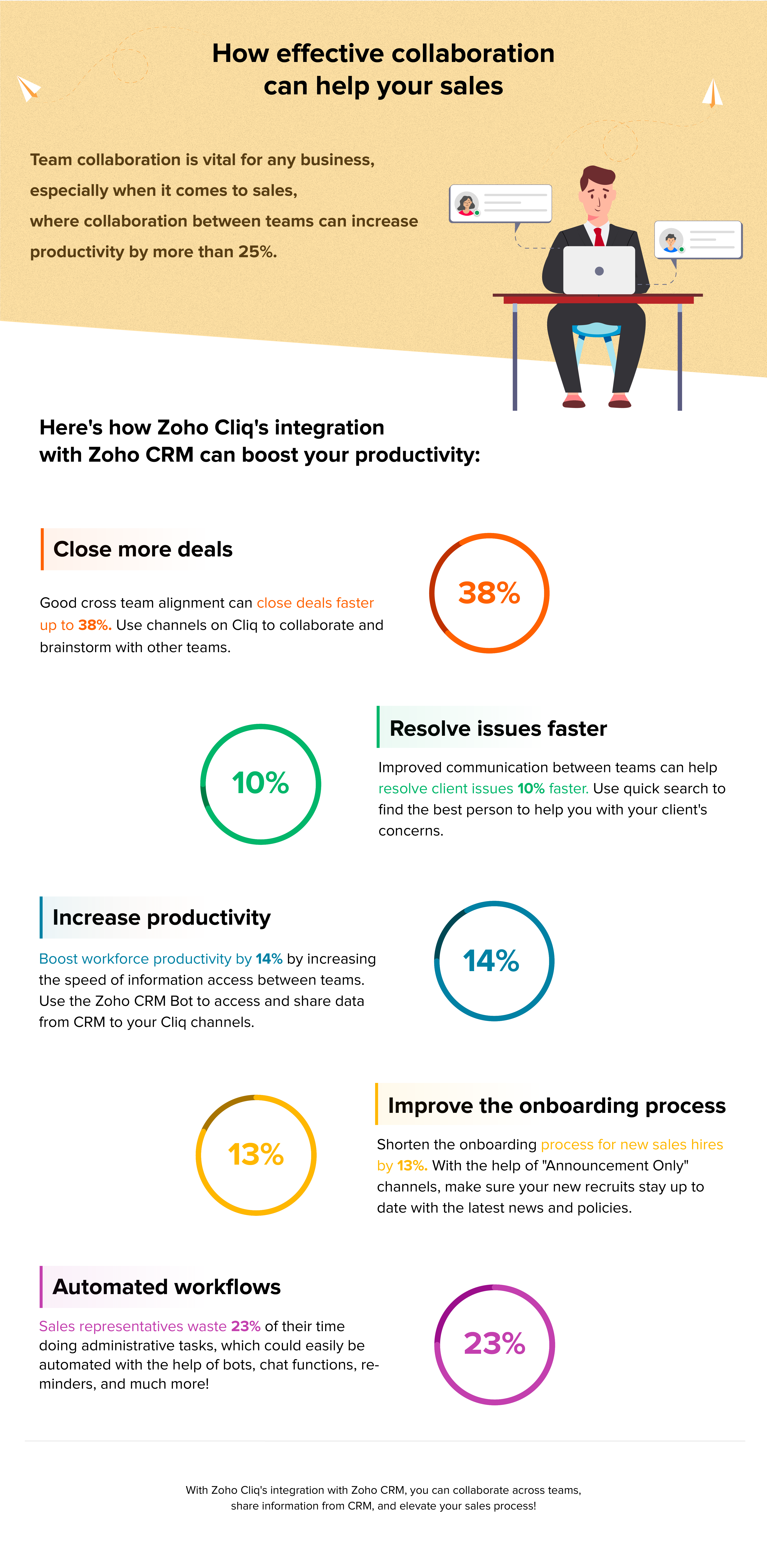 Studies show how communication breakdown between employees leads to a drop in sales by 18%. This is where Zoho Cliq's integration with Zoho CRM comes to the rescue!