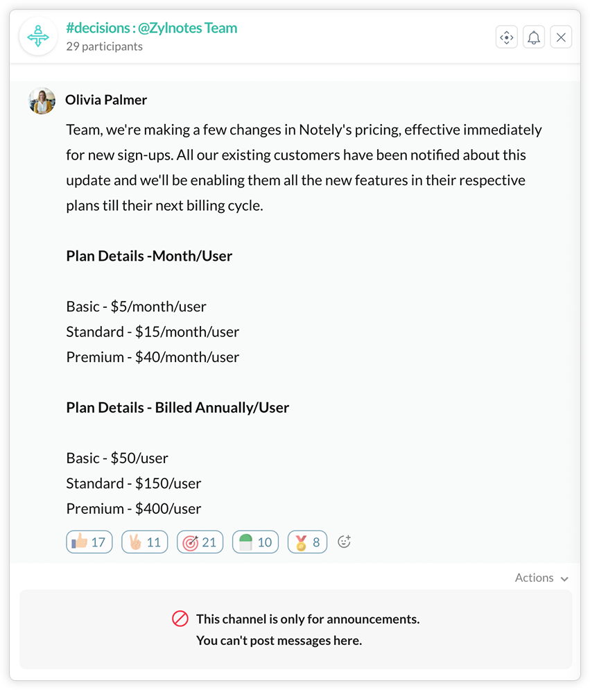Cliq Tip #2:Create a team-wide announcement-only channel called #decisions and use it to broadcast the team's goals, vision, and strategies. Pin all important messages to the top of the conversation, so no one misses it!