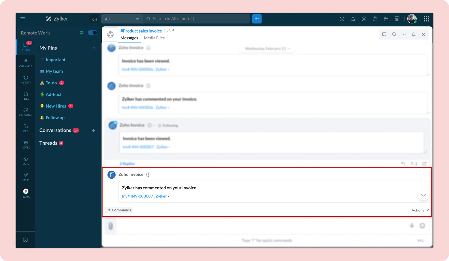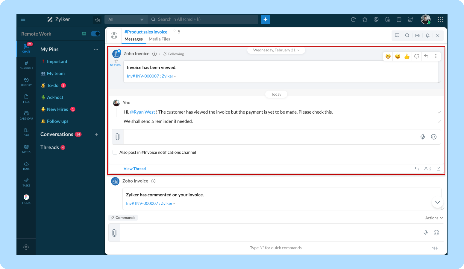 Once the integration is set up, your team members will receive instant notifications in Zoho Cliq whenever there's activity related to invoices. Whether it's a payment received or when a customer comments on your invoice, your team will be informed and empowered to deliver exceptional service to your customers.