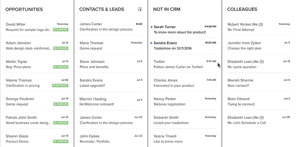 Merging the two is a no-brainer, to be honest. That’s exactly what Zoho SalesInbox does. It keeps emails organized according to the sales pipeline, and makes updating the CRM as easy as dragging and dropping emails between folders. And starting today, SalesInbox is also available for users of Salesforce CRM.