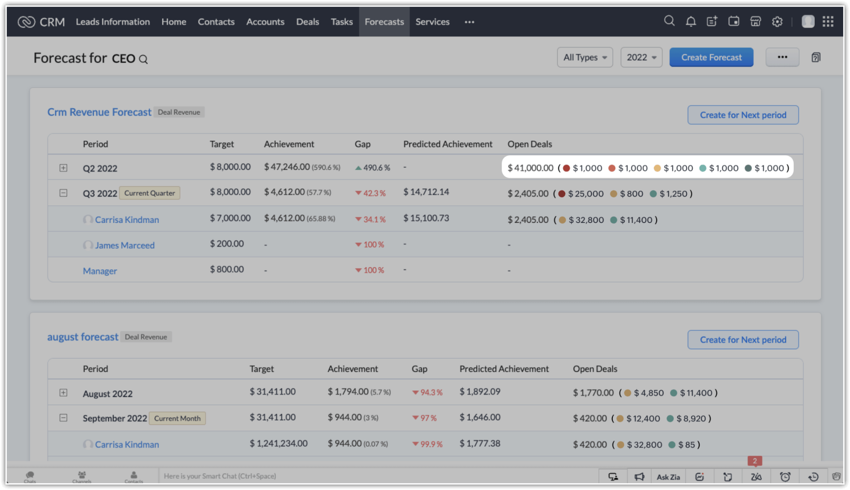 Compare across forecasts - Your sales team can even compare their targets, achievements, and open deals across different forecasting periods to see how their performance has evolved.