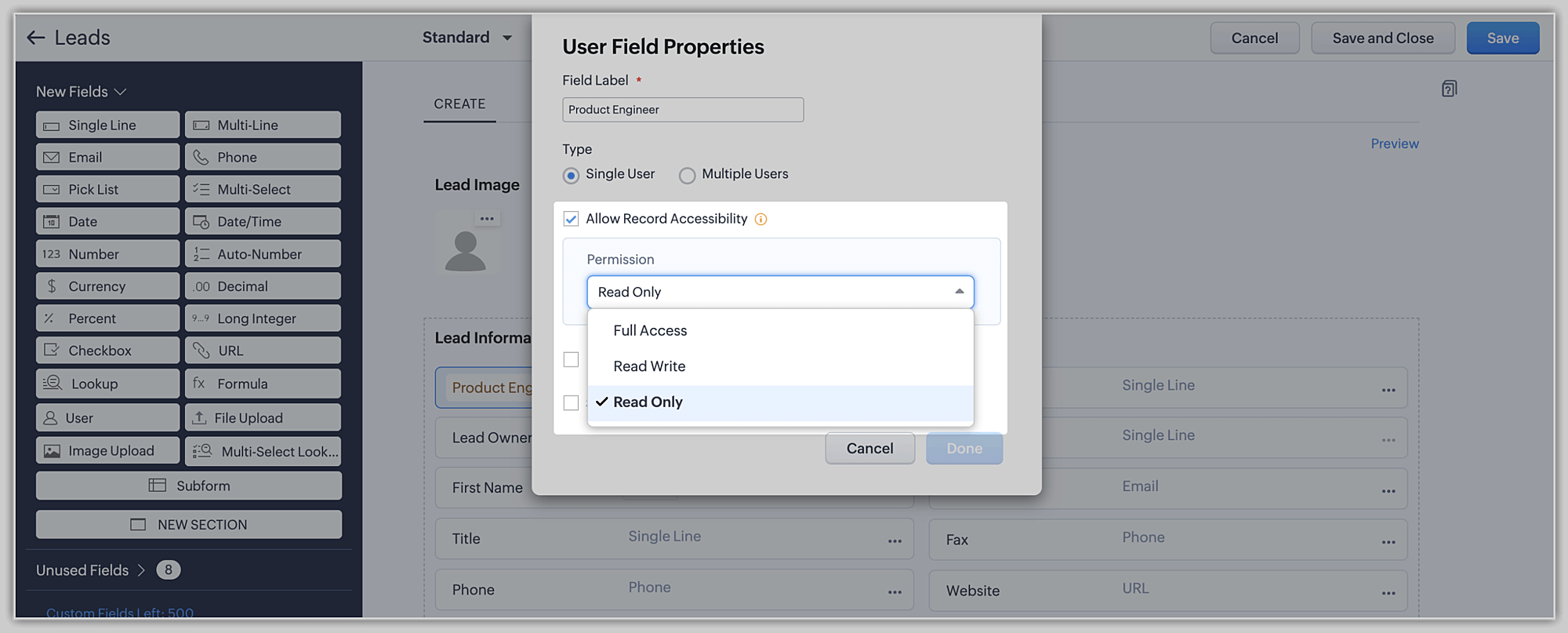 We've now introduced an enhancement to user fields to set accessibility controls for co-owners through which admins can decide if the co-owner has full access, read/write, or read only access to these records. Now your team can collaborate on important deals or prospects while maintaining your data's integrity.