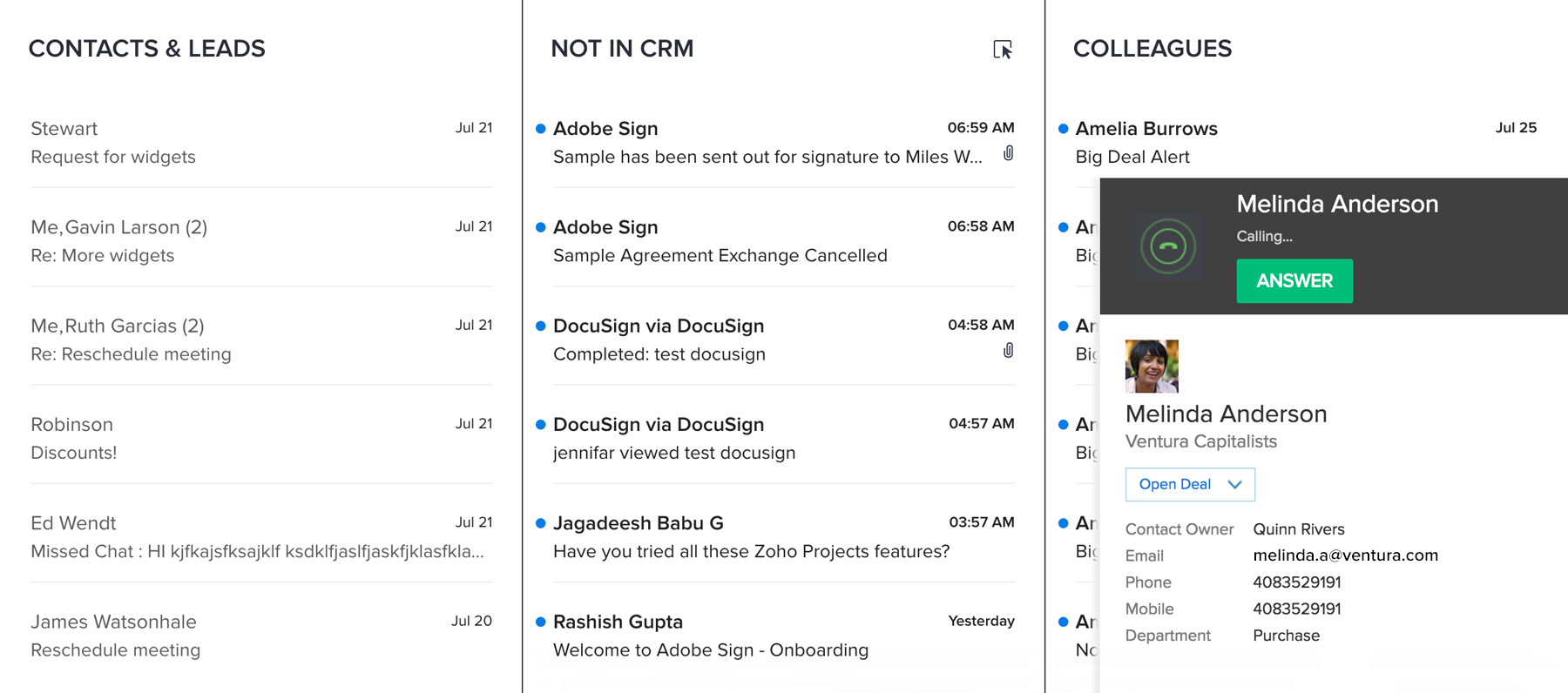 By connecting your phone system to Zoho CRM, it’s possible to build entirely new workflows that help make your processes much more efficient. For example, you can ensure that new leads from your website are contacted within minutes by letting your CRM tap into your telephony software and prompt available sales reps on their systems. Read about some more creative possibilities in this blog by one of our telephony partners, Ozonetel.