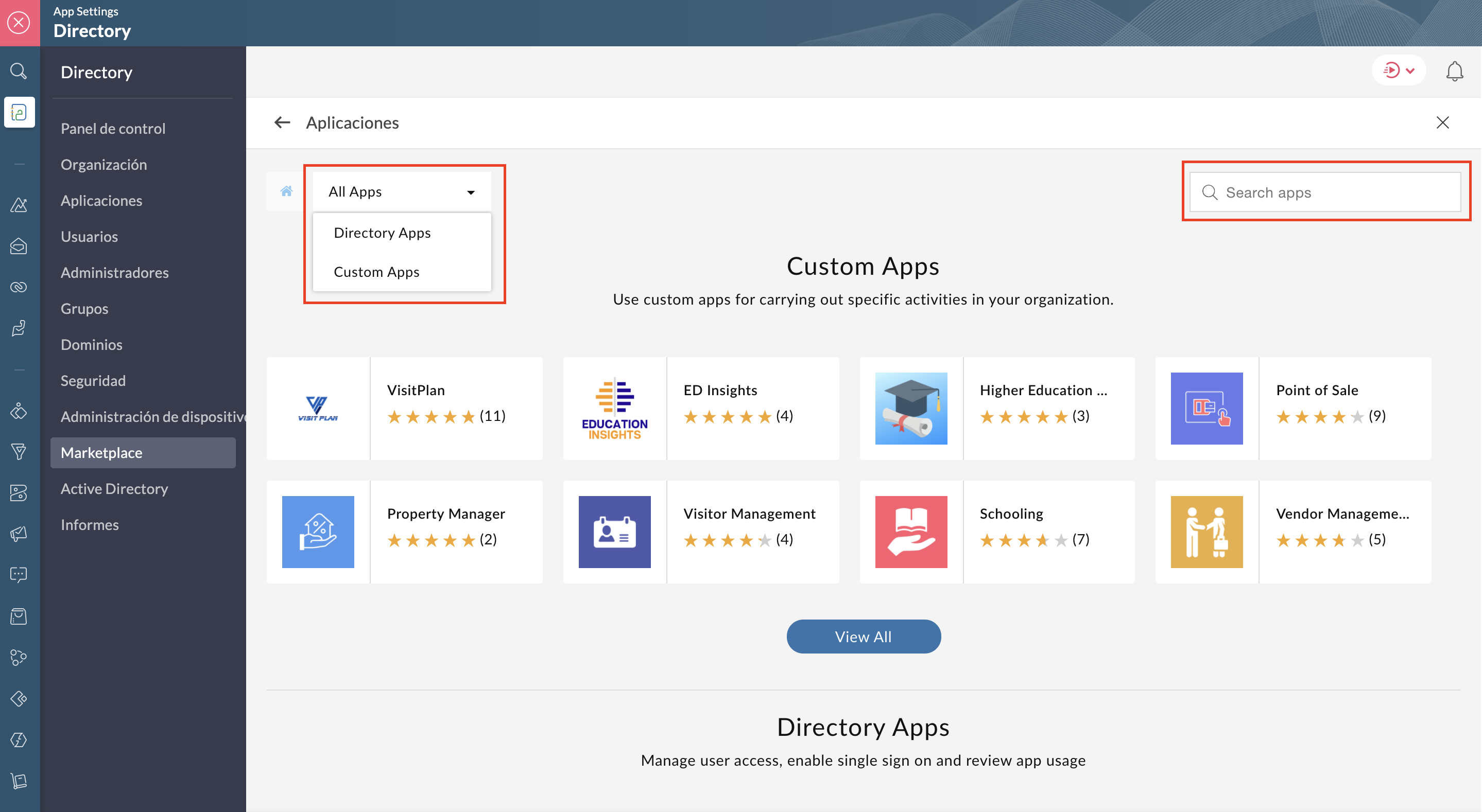 "text": "Seleccione el tipo de app que desea ver desde el menú desplegable o use la barra de búsqueda para encontrar una aplicación específica.",