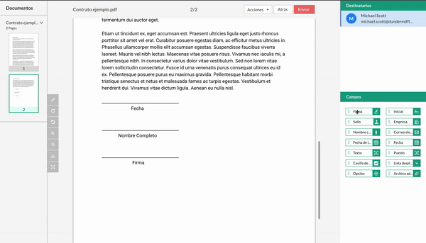 - Arrastre los campos que debe rellenar el firmante y dé click en enviar.
