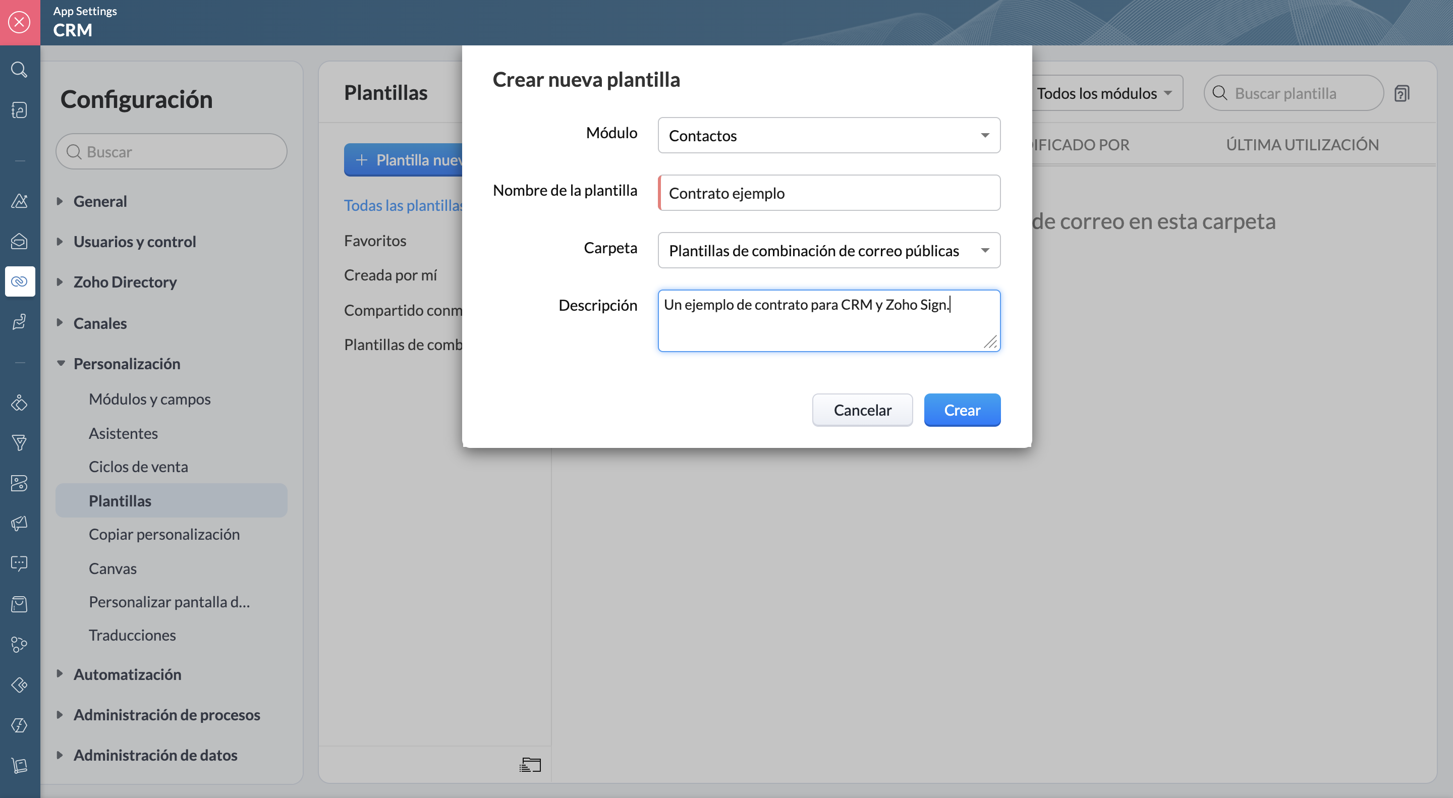 - Ingrese a la configuración de Zoho CRM. De click en Plantillas, bajo el menú de personalización.