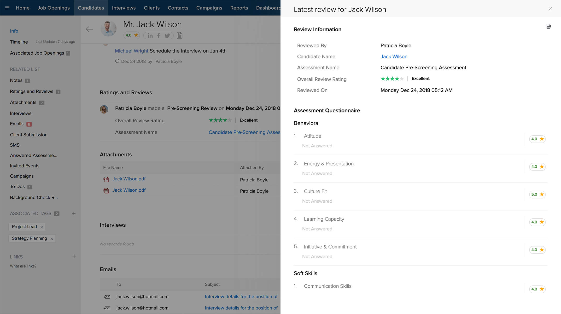 Crear una lista para la toma de decisiones puede ayudar a simplificar este proceso. Con la función "tarjeta de puntuación de entrevistas" de Zoho Recruit, los entrevistadores pueden clasificar a los candidatos en función de su recomendación general y agregar un comentario al final de la entrevista.