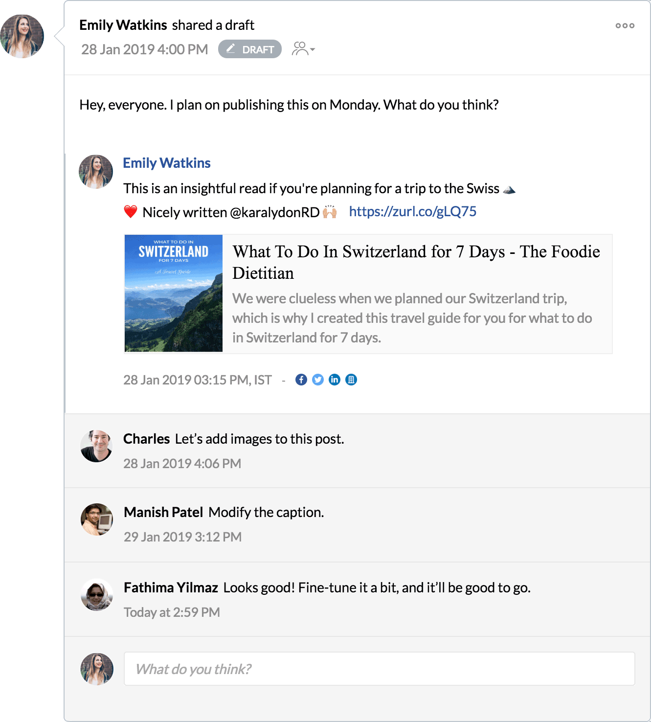 Además de las juntas, es importante tener herramientas que le permitan tener un proceso eficiente de creación y aprobación de contenido para seguir trabajando en tiempo real. Zoho Social le da la opción de crear borradores, hacer comentarios y aprobaciones en una misma plataforma.