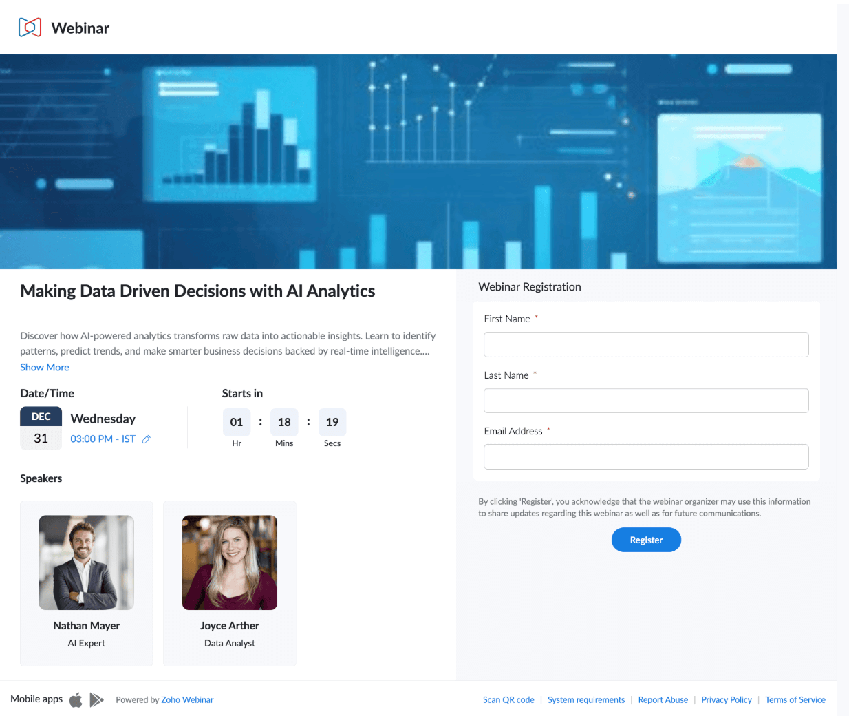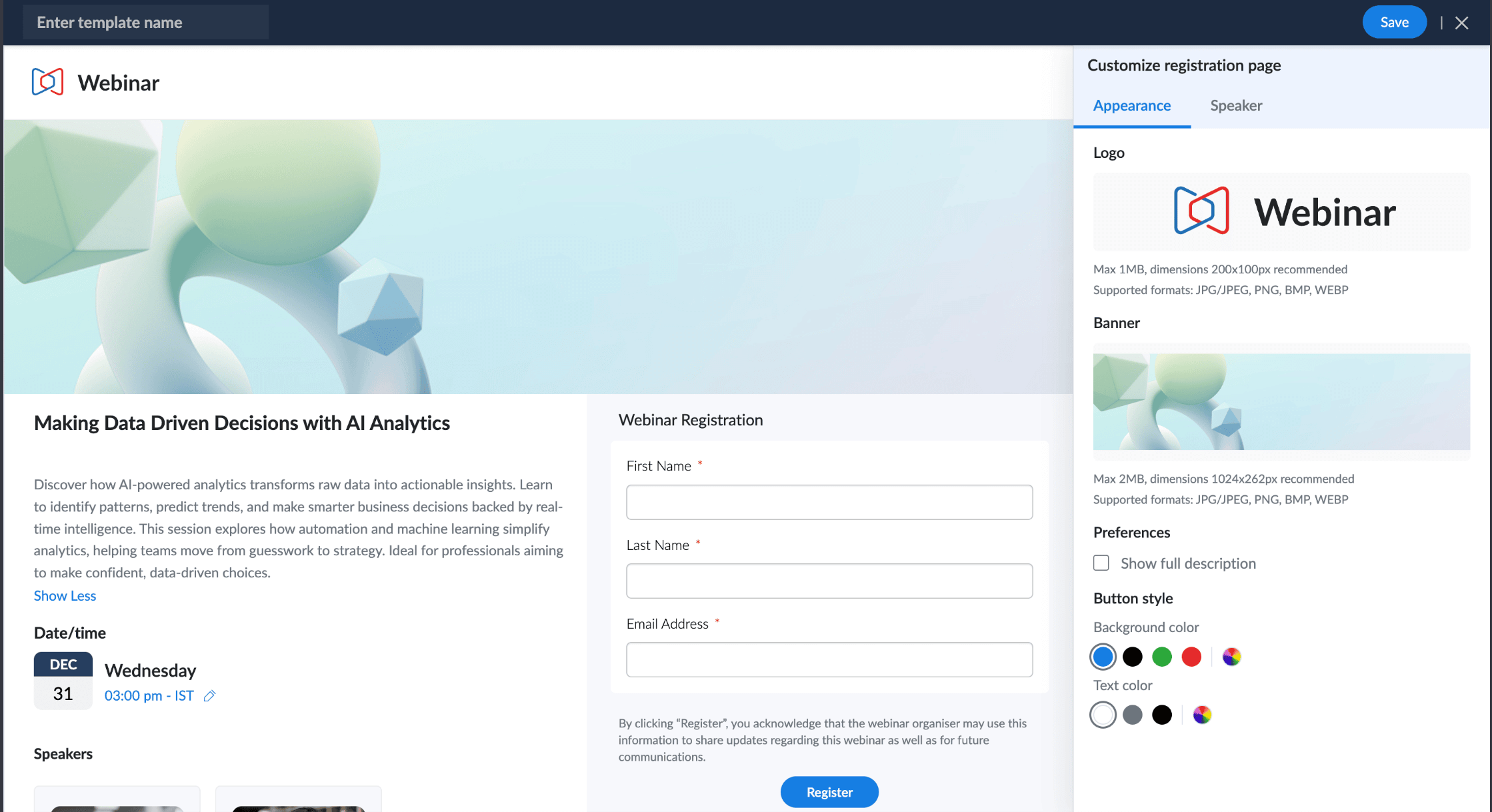 La función de branding de registro de Zoho Webinar no solo recolecta correos electrónicos, sino que cautiva a los visitantes y grita tu marca desde el primer clic. Se acabaron las plantillas genéricas que se pierden en el ruido. Ahora puedes personalizar toda la experiencia de registro eligiendo un diseño, subiendo tu logotipo y banner, y destacando a tus ponentes invitados. Es como ponerle un traje a medida antes de que empiece la función.