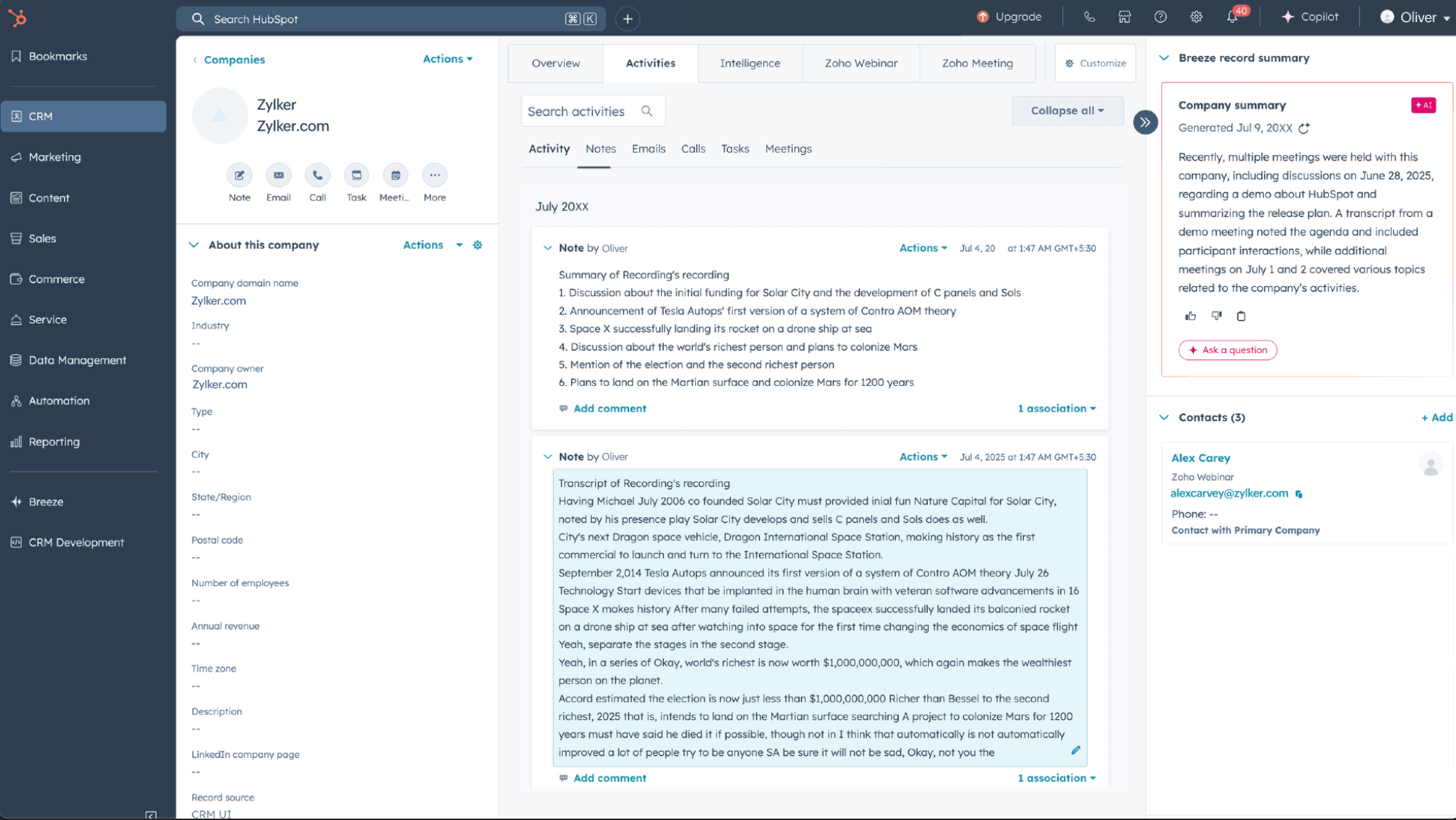 Notas con grabaciones, transcripciones y chats de webinars: Todas las grabaciones, chats y transcripciones se guardan automáticamente en las notas de contacto, facilitando revisar conversaciones y personalizar seguimientos.