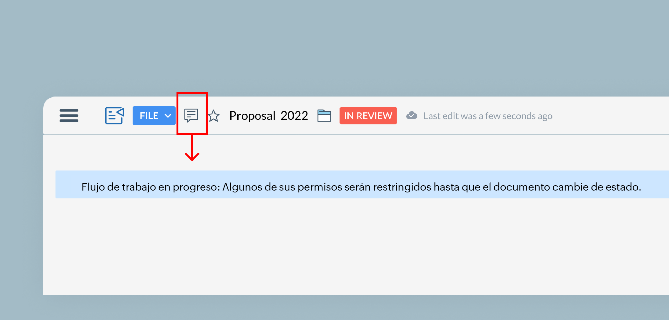 A medida que su documento avanza a través del flujo de trabajo, puede ver su estado (Listo para revisión, En revisión, Cambios sugeridos, En aprobación y Aprobado) en la parte superior del documento.