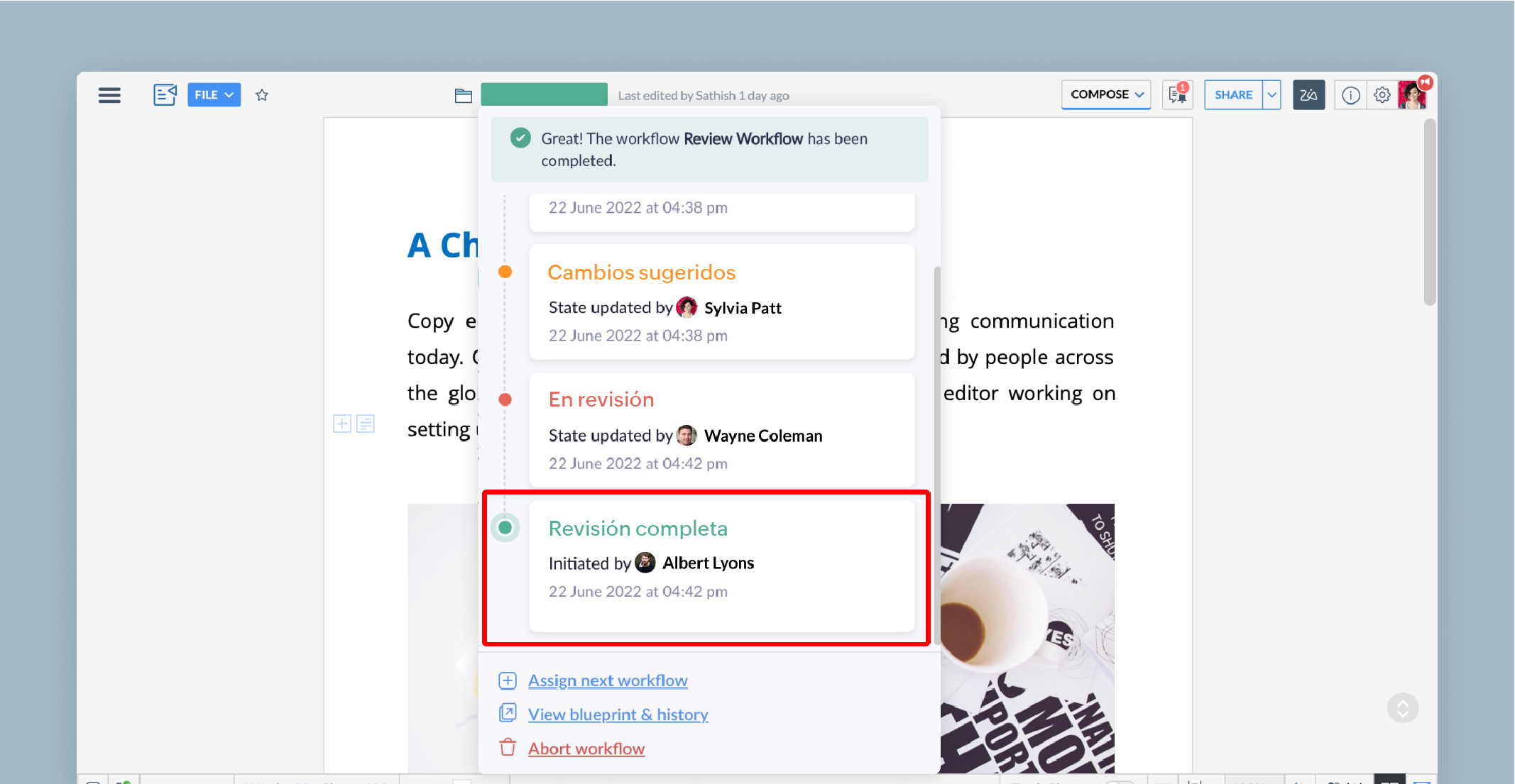 Sabiendo eso, agregamos flujos de trabajo preconfigurados en Zoho Writer para automatizar sus procesos editoriales y de aprobación.