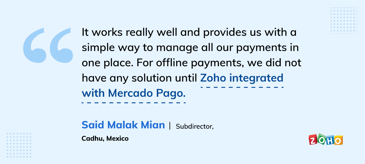 We realized there was so much we could do to make your business more effortless, and it all starts with more flexible payment options. Because of this, we integrated with LATAM's most popular payment gateway, Mercado Pago. You can now receive payments using the de facto payment method for nearly 100 million users right from your Zoho applications.