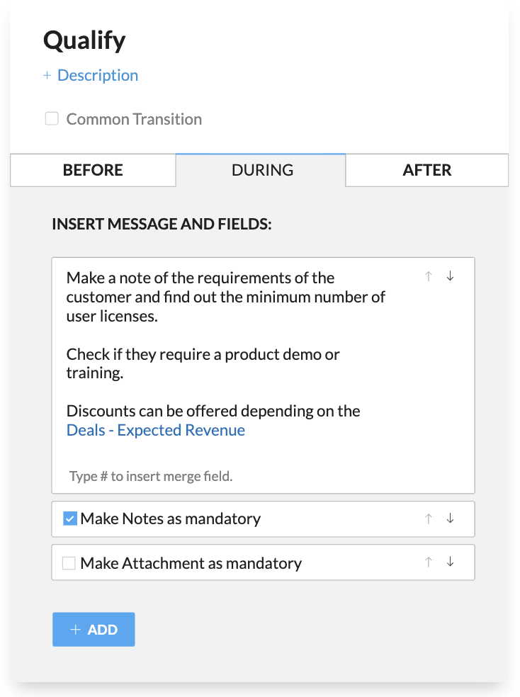 Et pour que vos commerciaux ne laissent jamais un rendez-vous sans notes utiles, Zoho CRM permet de rendre la saisie de notes obligatoire à certaines étapes du processus de vente via l’automatisation Blueprint.