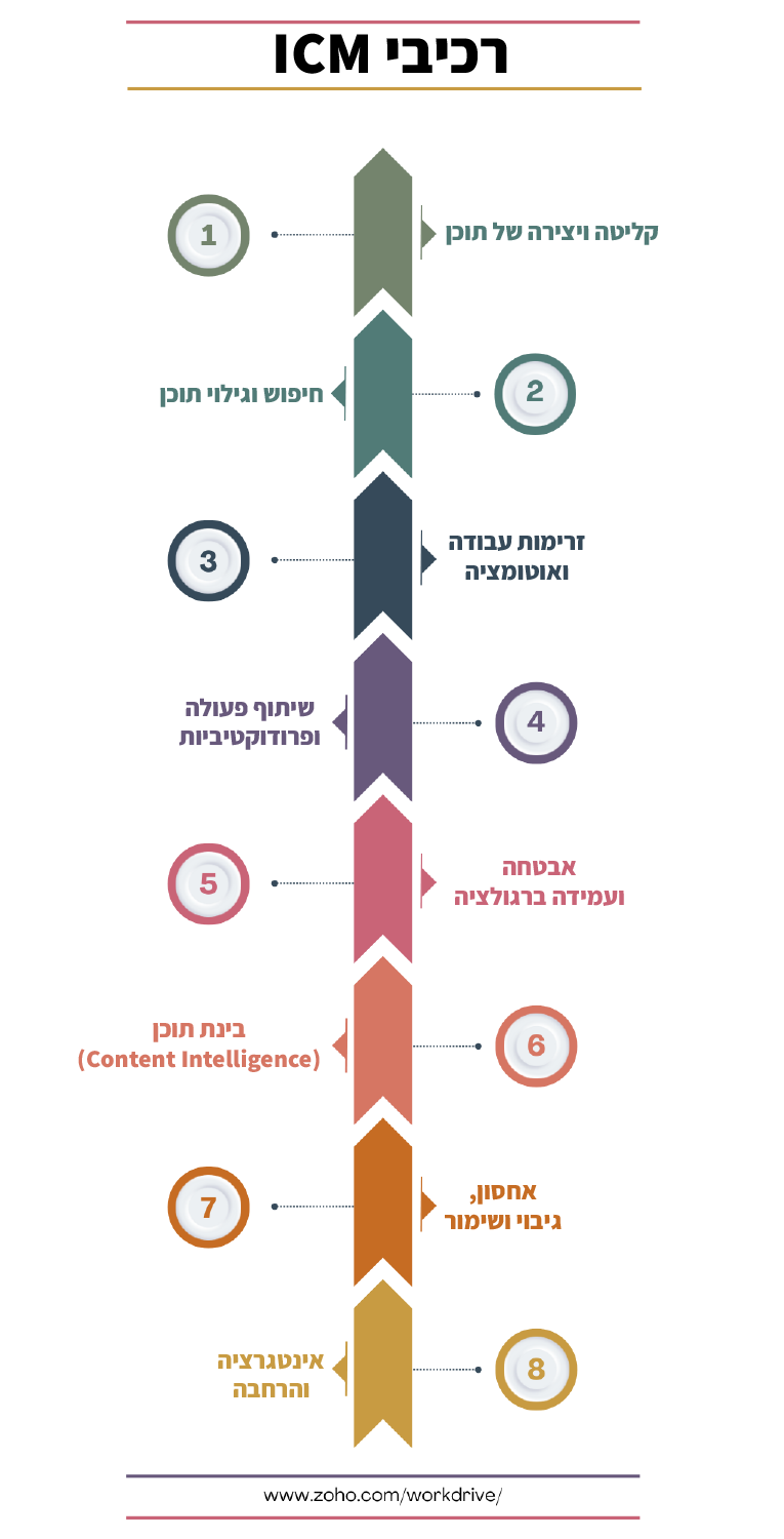 ניהול תוכן חכם מקיף את כל מחזור החיים של התוכן. הרכיבים העיקריים שלו כוללים: