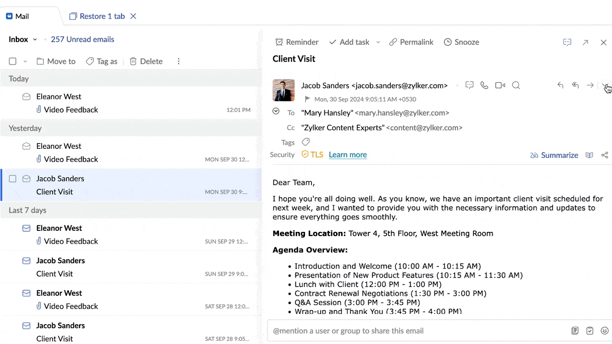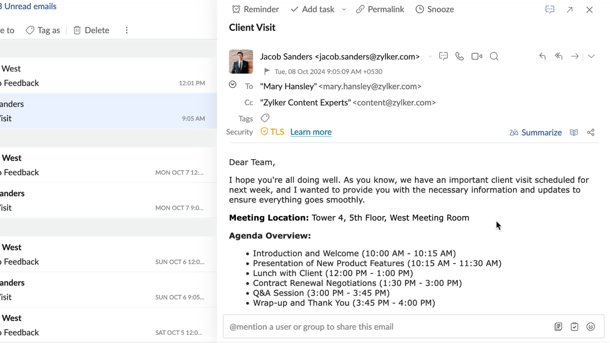AI Zoho Mail dapat meringkas rangkaian email yang panjang, menarik poin-poin terpenting sehingga Anda dapat dengan cepat mencerna kontennya. Fitur ini sangat berguna bagi para profesional yang mengelola beberapa proyek atau menerima arahan klien yang ekstensif.