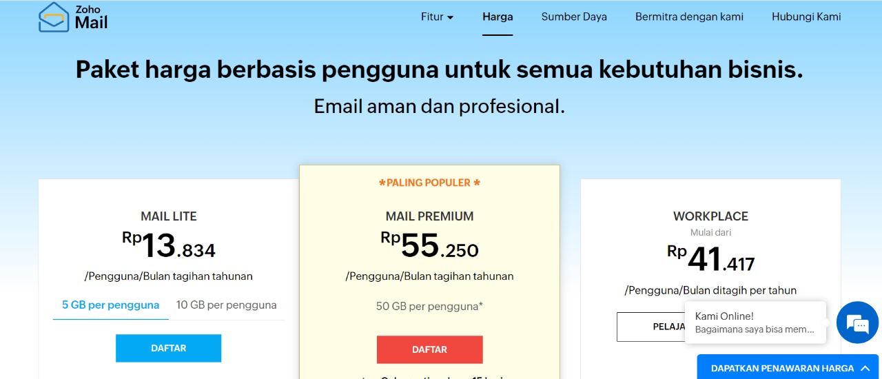 Zoho Mail menawarkan harga yang kompetitif dengan struktur berjenjang, mulai dari email perusahaan gratis untuk pengguna pribadi dan paket berbayar yang terjangkau untuk email perusahaan yang lebih baik.