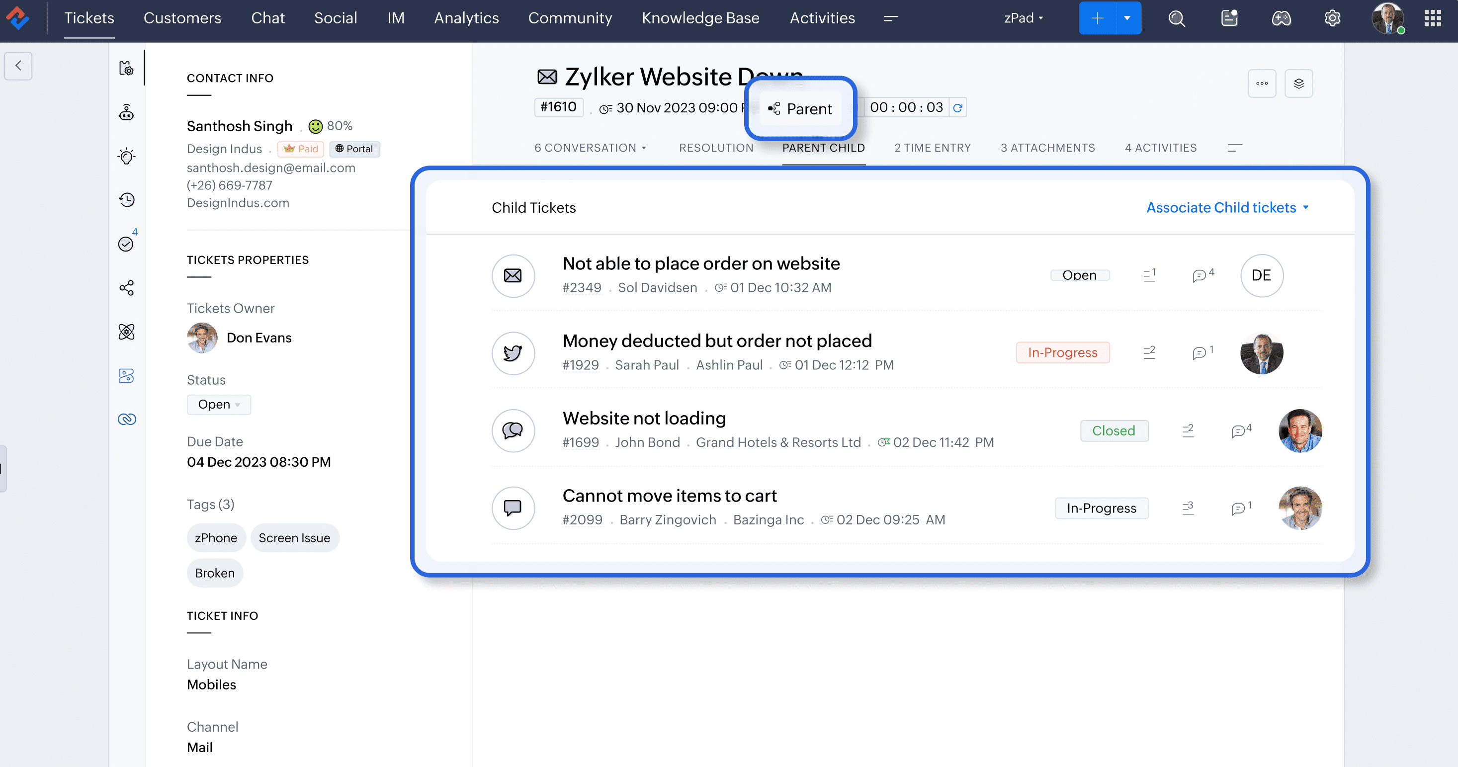 O ticket pai-filho no Zoho Desk permite que você conecte tickets relacionados e os gerencie como uma única unidade. É como ter uma árvore genealógica para seus tickets de suporte, onde um ticket principal (pai) pode ter vários sub-tickets (filhos) vinculados a ele.