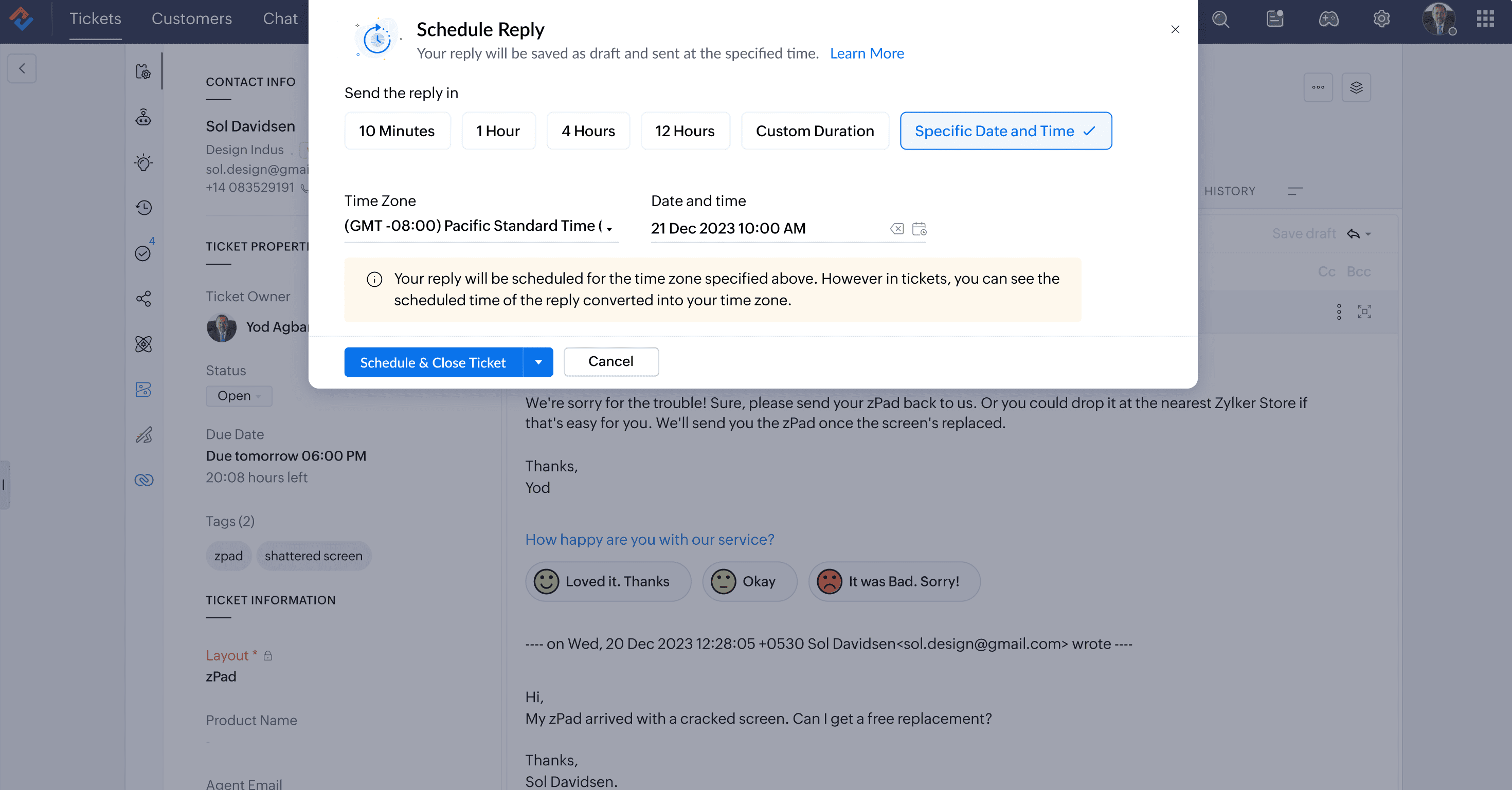 Embora o Atendimento ao Cliente rápido seja importante, há momentos em que responder a um cliente imediatamente não é ideal. Nesses casos, o Zoho Desk permite que você agende a resposta para mais tarde. Basta escolher uma data e hora futuras, e sua resposta será enviada automaticamente, não importa onde você esteja. Você também tem a flexibilidade de editar, reagendar ou excluir suas respostas agendadas a qualquer momento antes de serem enviadas.