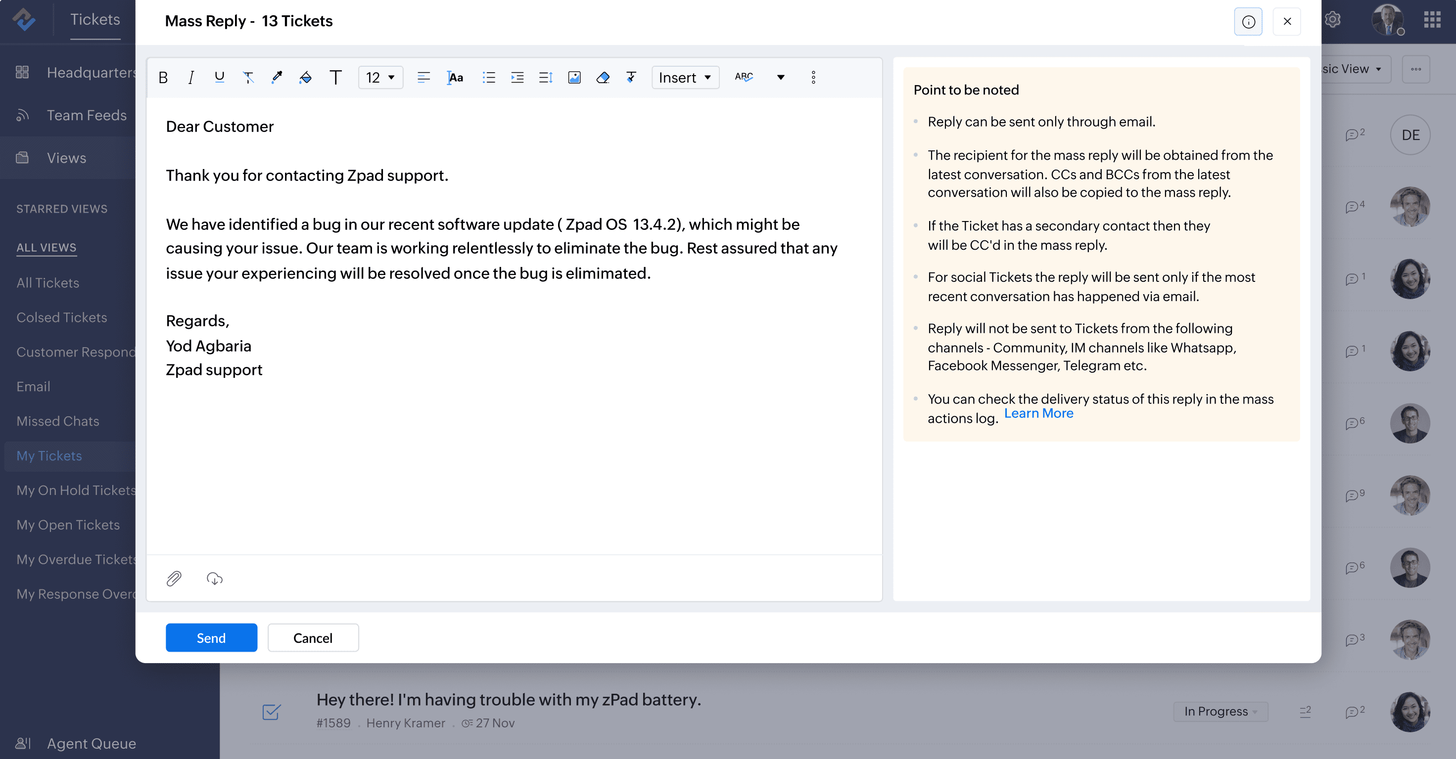 O novo recurso de resposta em massa permite que você aborde vários tickets com uma única resposta. Por exemplo, quando você tem um aumento repentino de tickets decorrentes de um atraso temporário no pedido, em vez de responder a cada ticket individualmente, você pode selecionar todos os tickets relevantes e enviar uma mensagem a todos os clientes afetados de uma vez. Isso não apenas economiza tempo, mas também garante consistência na comunicação quando você está recebendo um alto volume de tickets.