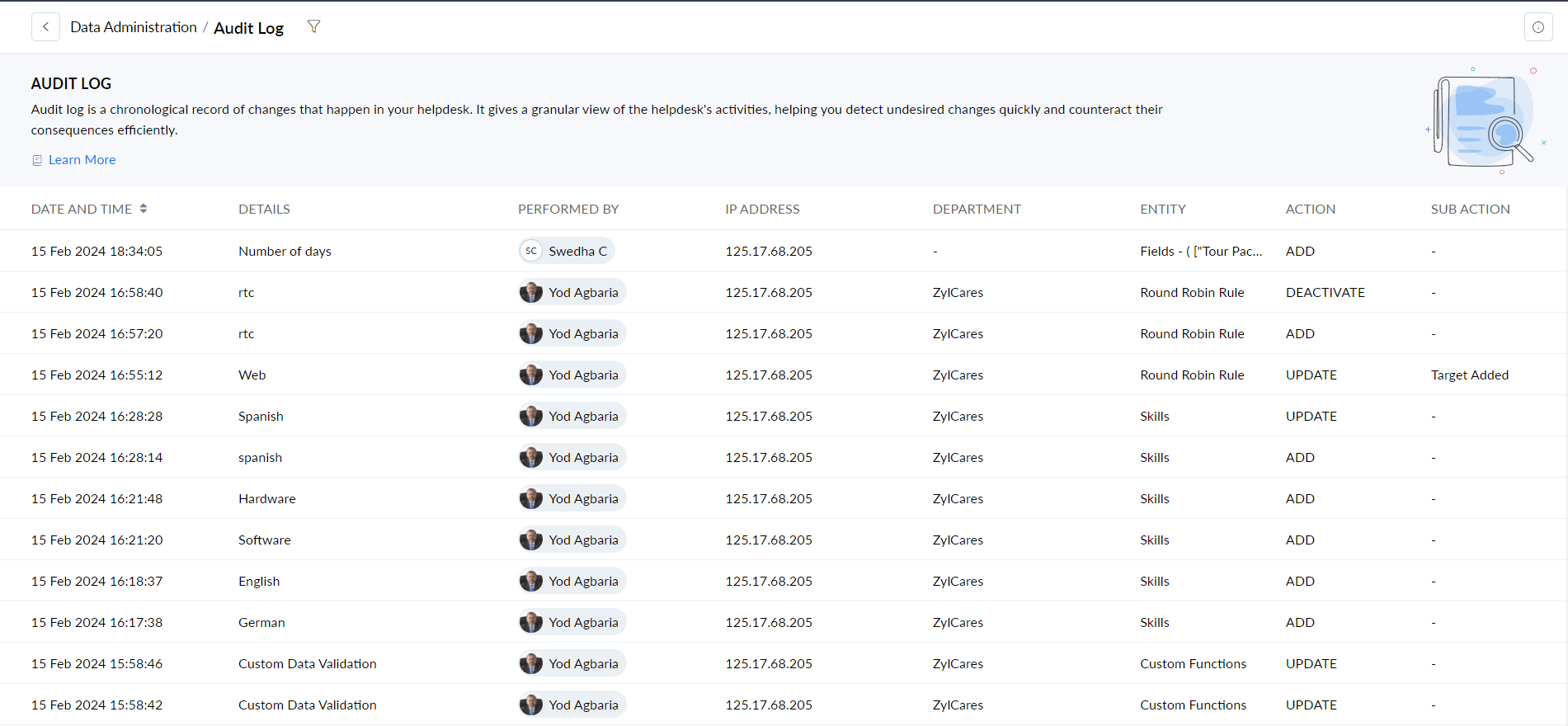 Ao fornecer essa visão detalhada, o registro de auditoria permite identificar rapidamente erros, solucionar problemas de forma eficaz, reverter alterações indesejadas antes que causem problemas e avaliar a eficiência de seus processos. Os registros de auditoria ajudam a rastrear ações de atualização, adição e exclusão relacionadas a módulos personalizados e automação. A capacidade de rastrear ações em outros recursos será adicionada em fases futuras.