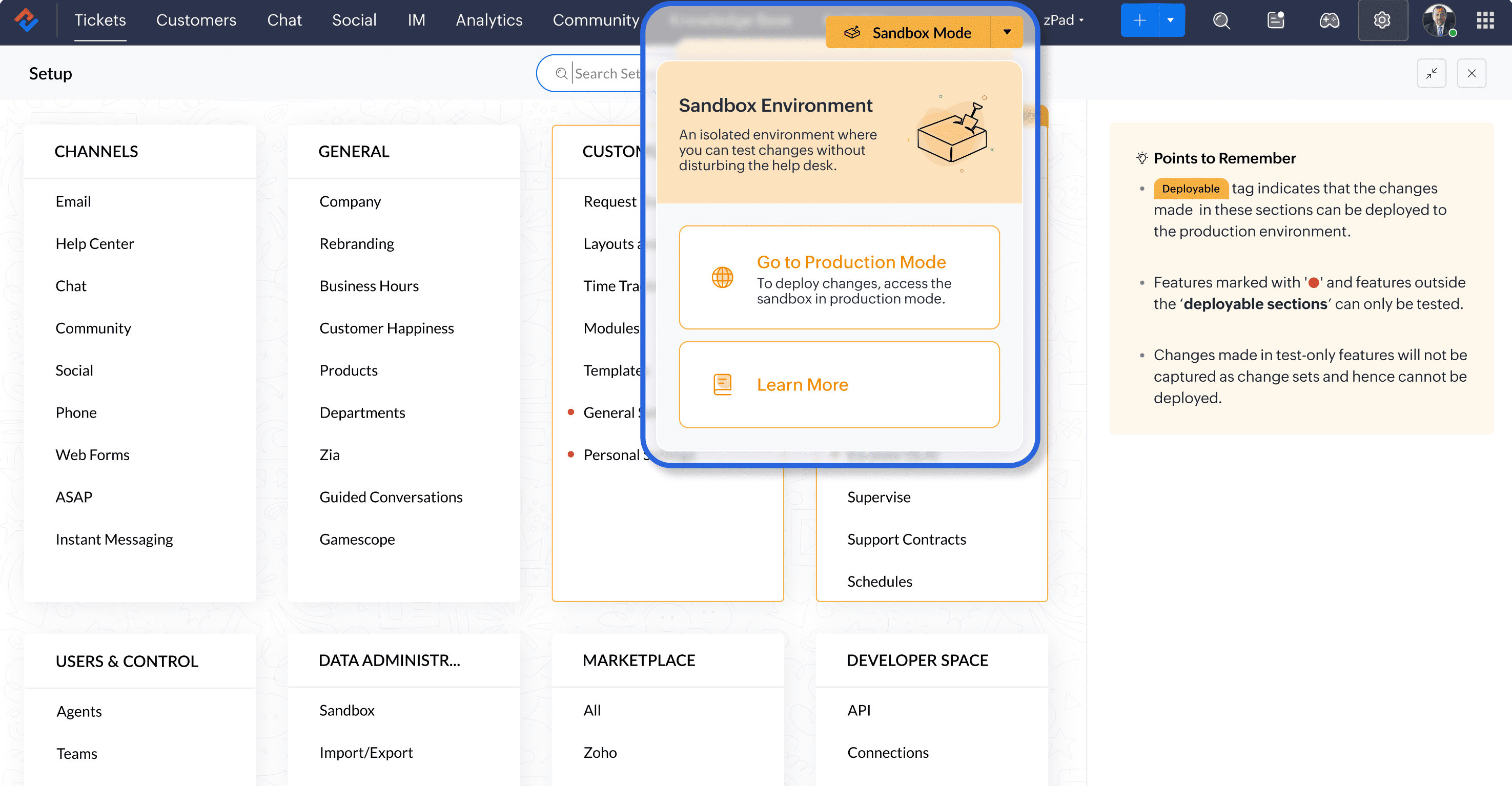 Você pode evitar esse tipo de situação testando mudanças no roteamento de tickets no ambiente de sandbox do Zoho Desk antes de implementá-las. Isso permite que sua equipe explore ideias livremente e teste possíveis casos de uso sem afetar suas interações contínuas com os clientes. Esta réplica do seu espaço de trabalho ao vivo permite que você experimente recursos, colabore sem problemas, treine agentes, experimente personalizações e ajuste fluxos de trabalho e regras de automação em um espaço seguro antes de implementá-los em seu ambiente ao vivo.