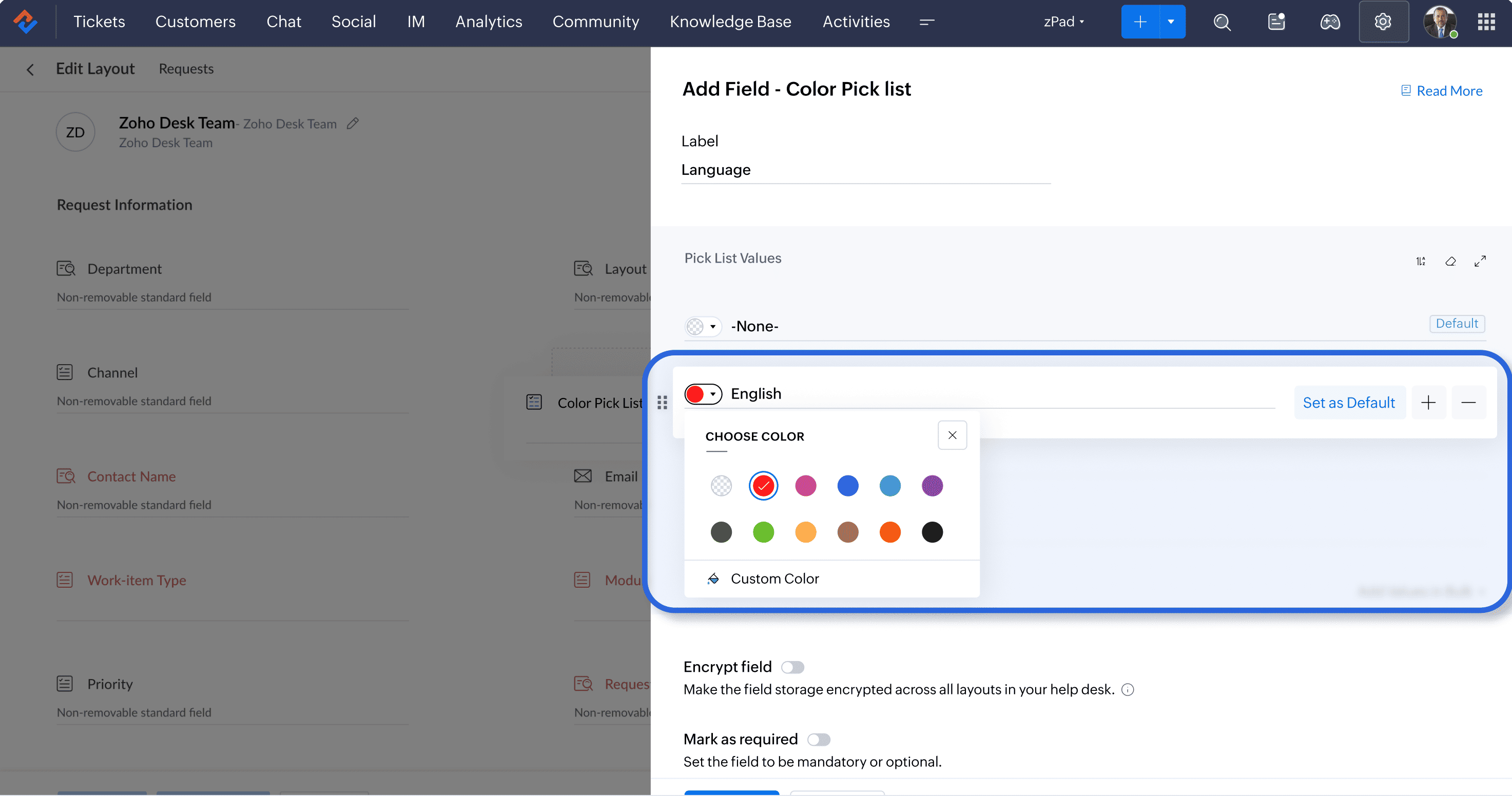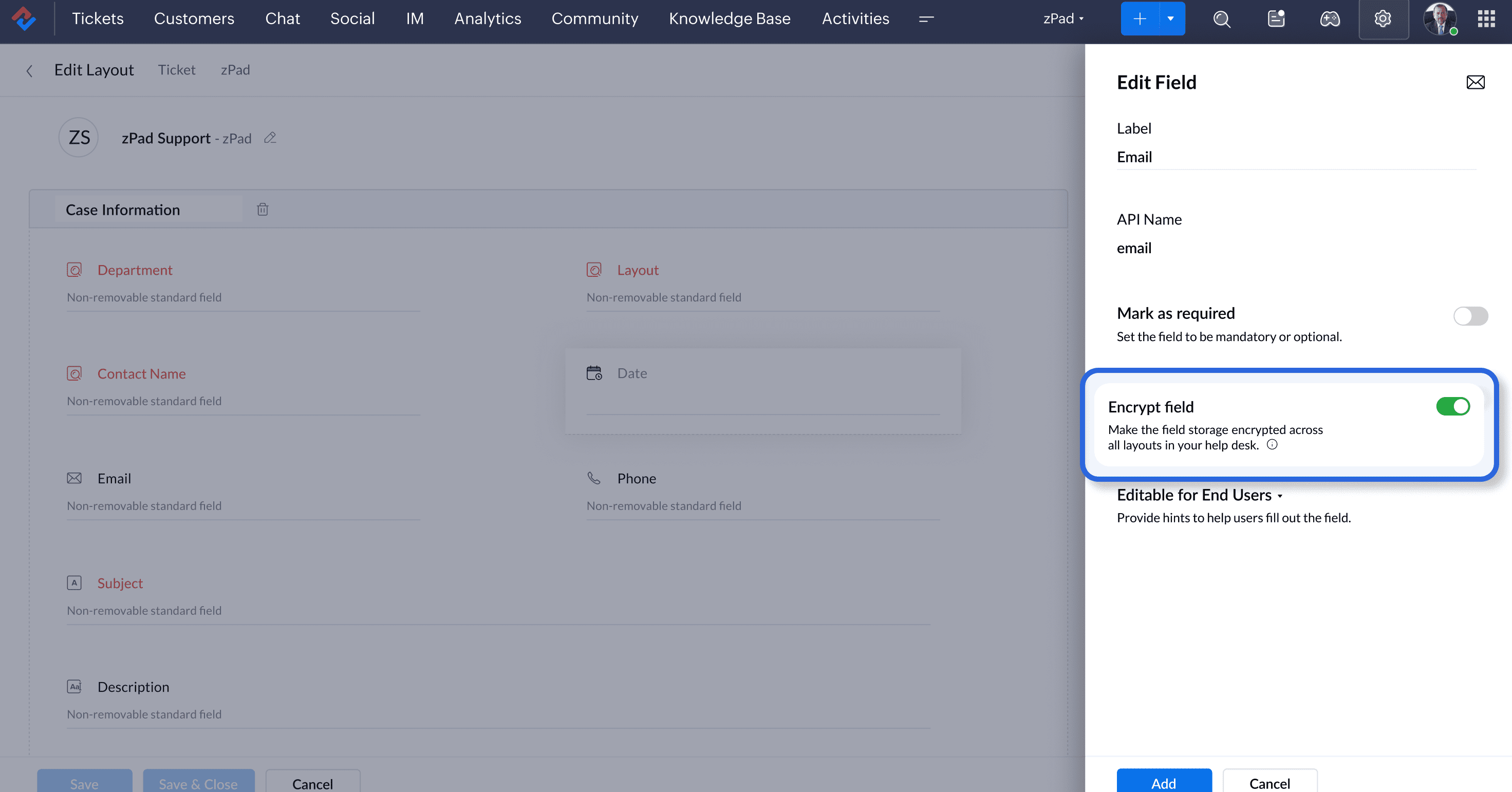 Coletar dados do cliente é uma parte essencial dos negócios e vem com uma responsabilidade significativa. A criptografia de dados sensíveis é crucial para manter a confidencialidade e evitar acesso não autorizado, especialmente em sistemas de suporte. O Zoho Desk oferece criptografia para campos padrão como nomes de clientes, números de telefone e detalhes bancários, usando o Advanced Encryption Standard (AES), proporcionando um bloqueio virtual contra acesso não autorizado. Criptografar campos padrão no Zoho Desk pode reduzir o risco de violações de dados para empresas em setores regulamentados, como bancos e hospitais, que devem coletar informações sensíveis do cliente para fornecer serviços.