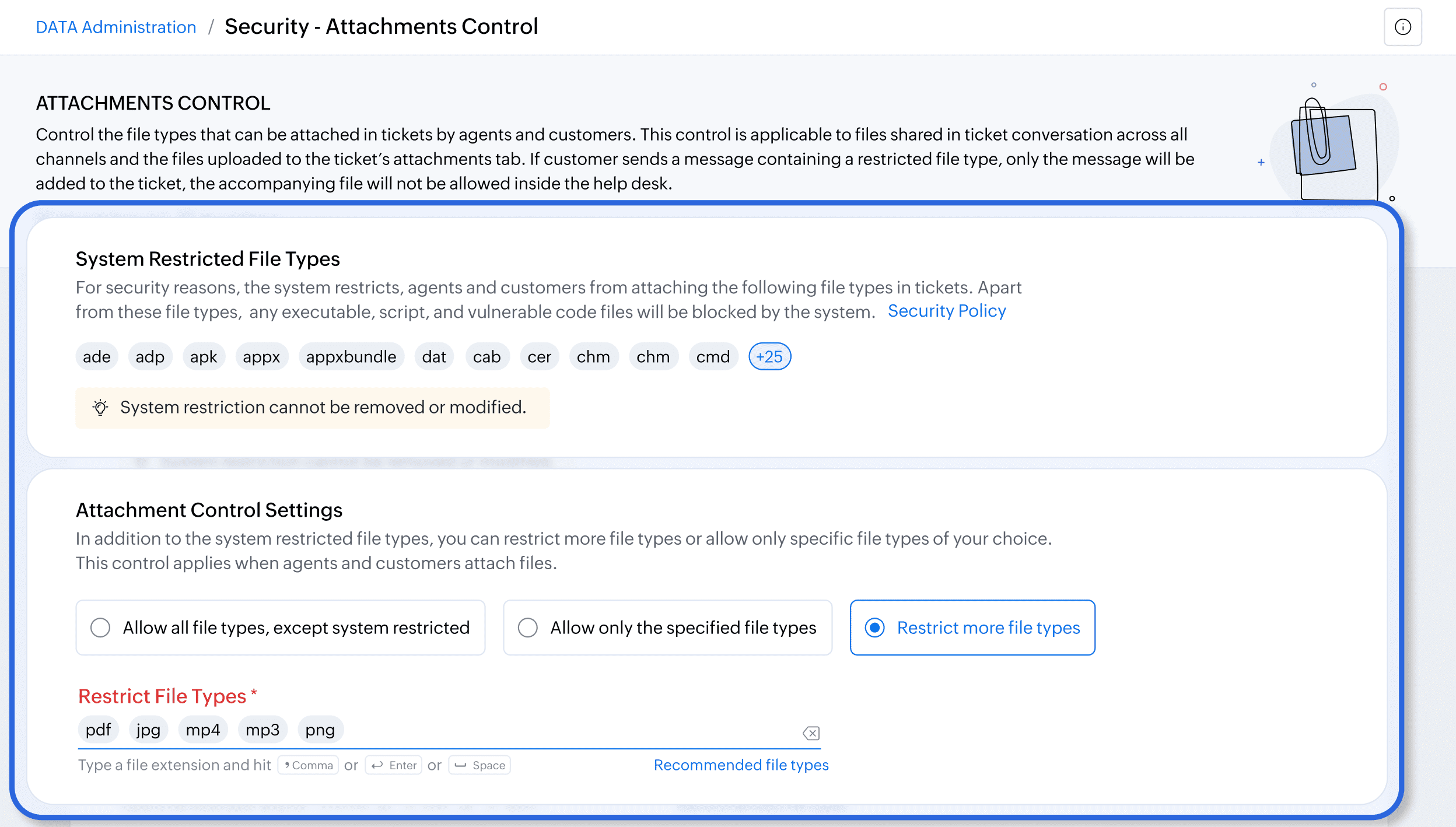 Agora você pode controlar quais tipos de arquivo os clientes ou agentes podem trocar como anexos por meio de qualquer canal de comunicação. Os controles de anexos do Zoho Desk permitem que os administradores definam formatos de arquivo específicos que os clientes ou agentes podem anexar a tickets de suporte ou mensagens. Por exemplo, você pode optar por limitar formatos de arquivo potencialmente prejudiciais como arquivos executáveis (.exe) ou arquivos compactados (.zip) para mitigar a probabilidade de propagação de malware ou vírus.