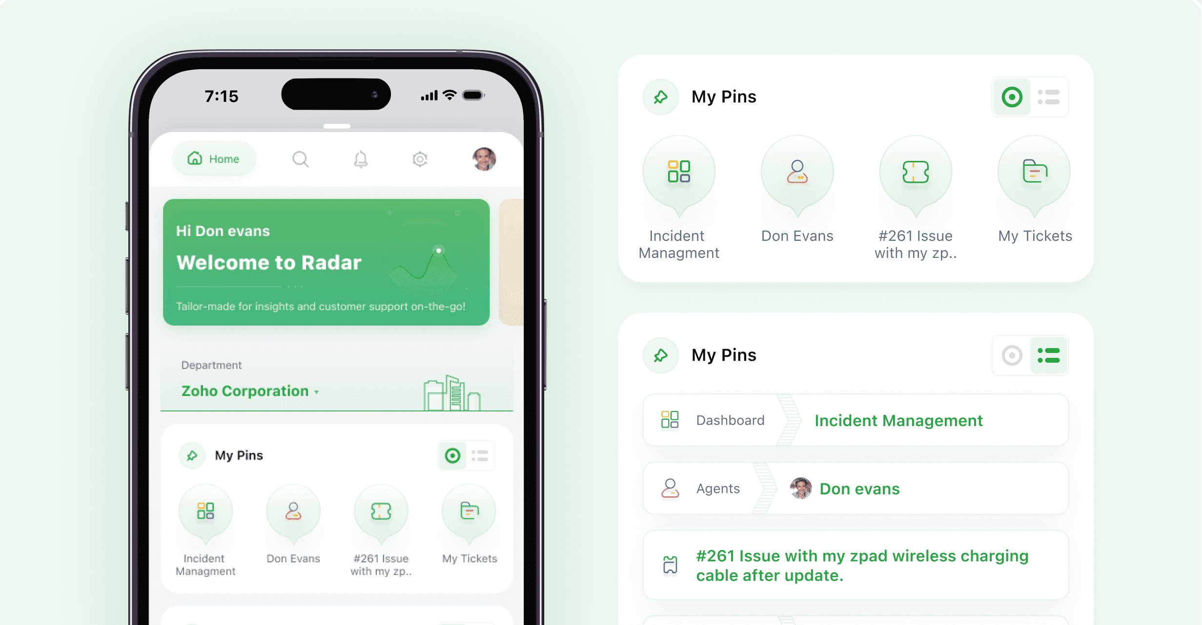 O aplicativo móvel Radar do Zoho Desk permite que você monitore estatísticas importantes de atendimento ao cliente e acompanhe problemas de qualquer lugar. Para simplificar ainda mais o rastreamento, introduzimos "Meus Pins". Agora, você pode fixar itens críticos como tickets importantes, relatórios ou painéis no topo do seu feed Radar para acesso rápido e fácil, sem a necessidade de navegar por menus ou procurar informações essenciais.