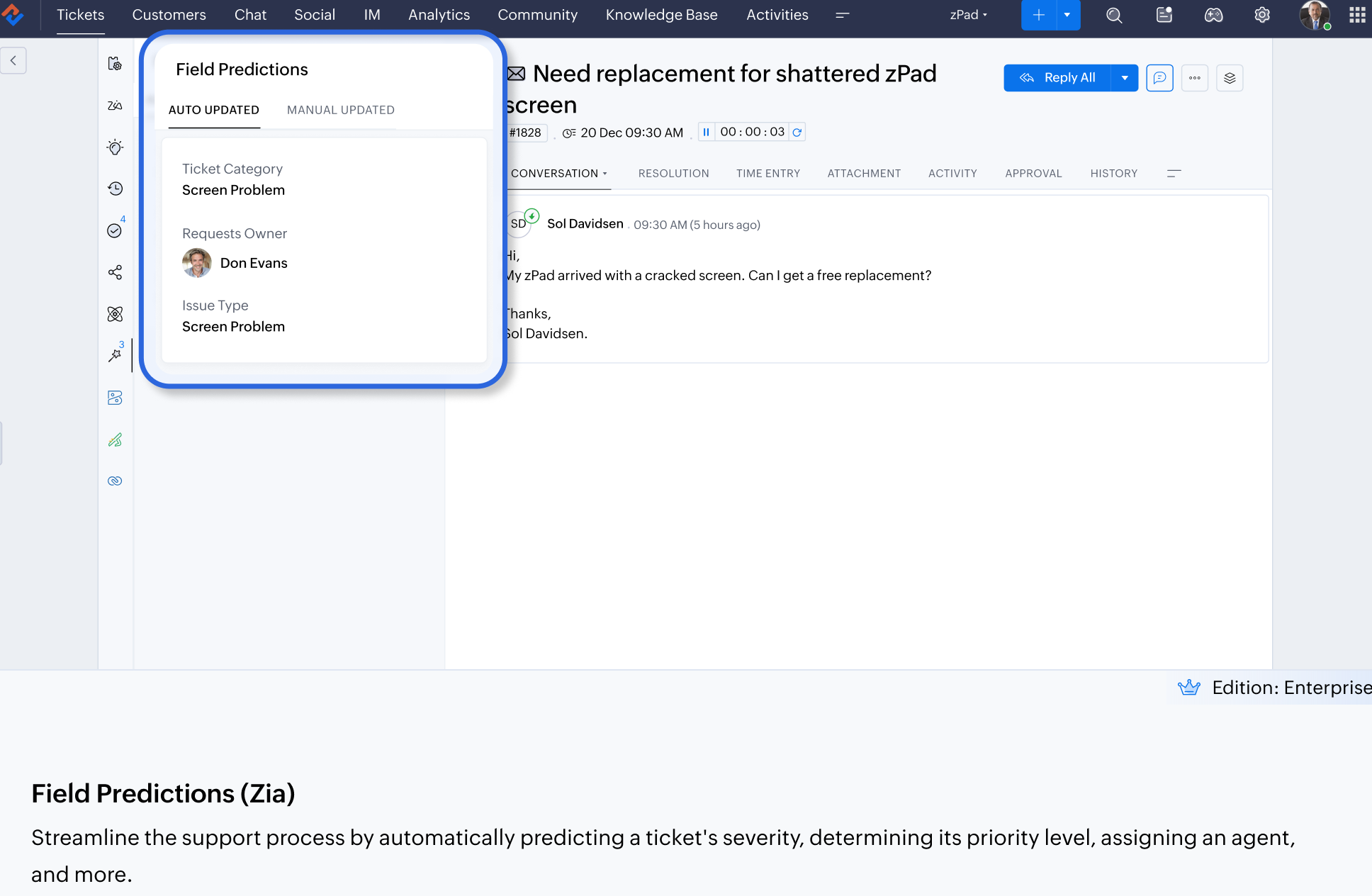 A Zia, assistente de inteligência artificial interativa da Zoho, agora pode ser treinada com seus dados de tickets existentes para encontrar padrões e regularidades. Armada com esse conhecimento, a Zia atualiza os campos dos tickets recebidos usando previsões de campo se a pontuação de precisão da previsão exceder o limite que você definir. Depois que a Zia analisa pelo menos 500 tickets, ela pode realizar tarefas como identificar o nível de prioridade do ticket, determinar a categoria do ticket, atribuir o proprietário correto do ticket e muito mais.