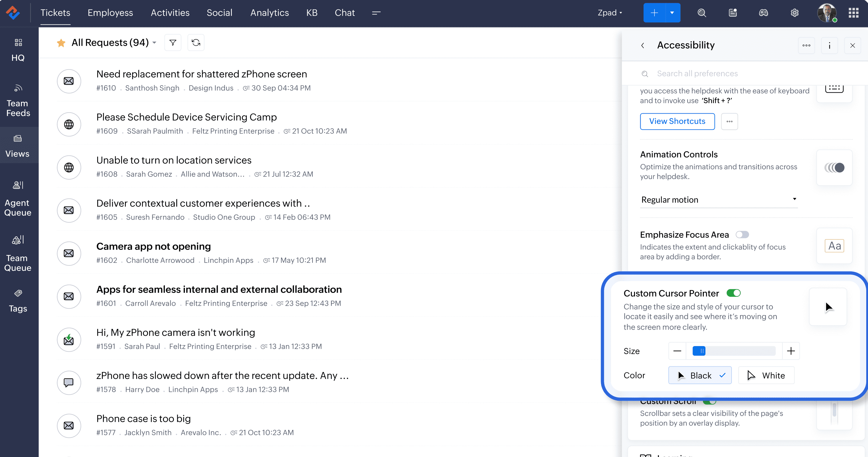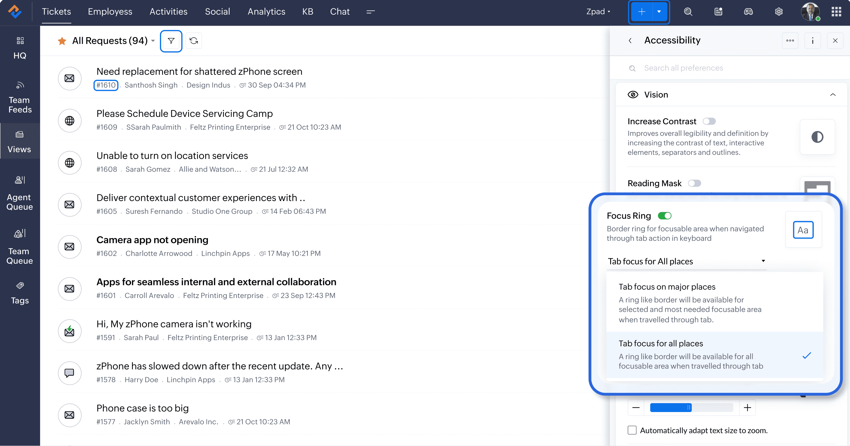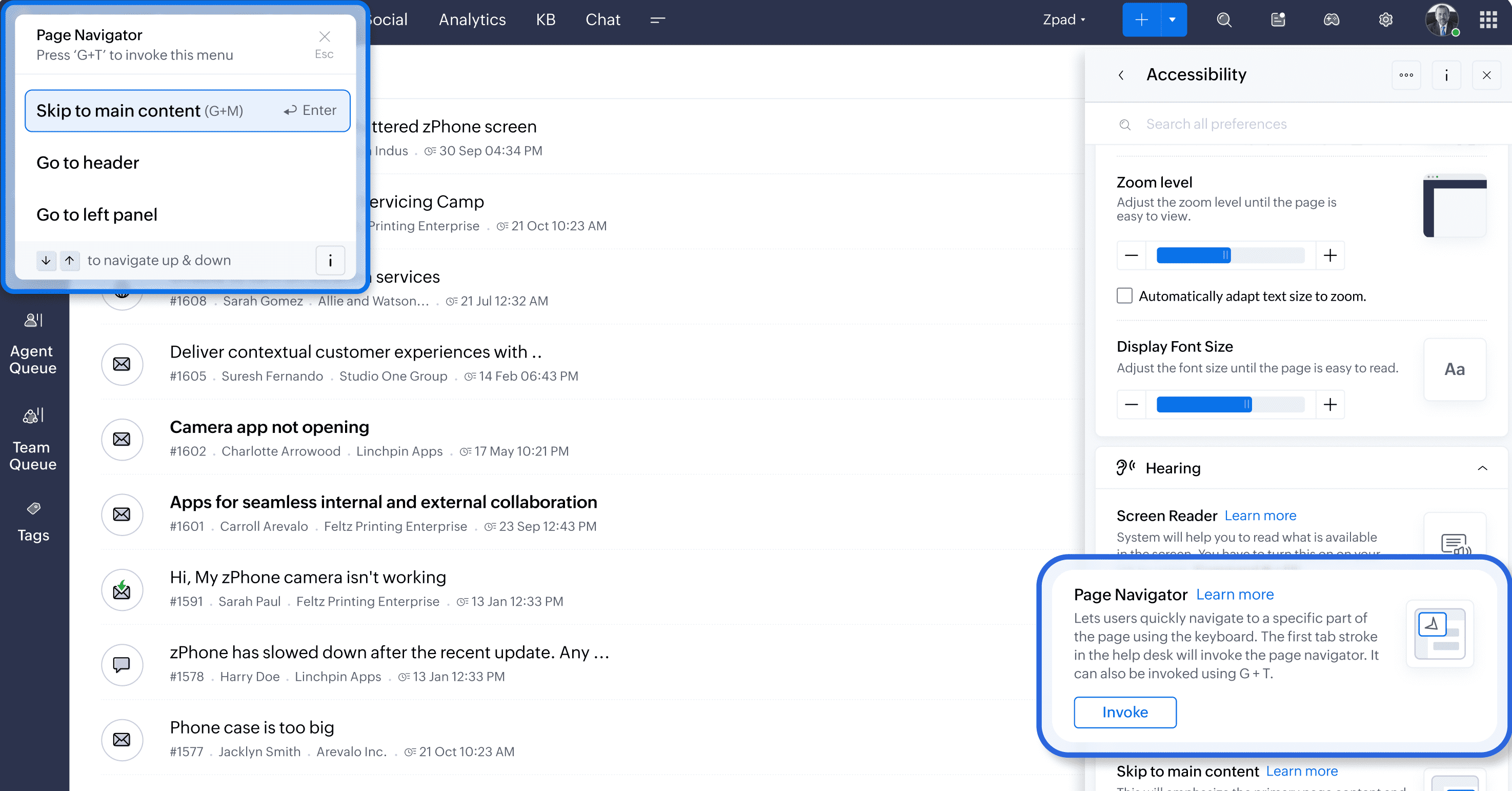 Apesar de 16% da população global ter alguma forma de deficiência, a divisão digital persiste. Sem dúvida, melhorar a acessibilidade e a inclusividade para pessoas com deficiência é um dos maiores impactos da tecnologia. Em nosso esforço contínuo para aprimorar a acessibilidade do Zoho Desk, estamos introduzindo novas maneiras de ajudar todos os usuários a realizar o potencial completo do Zoho Desk.
