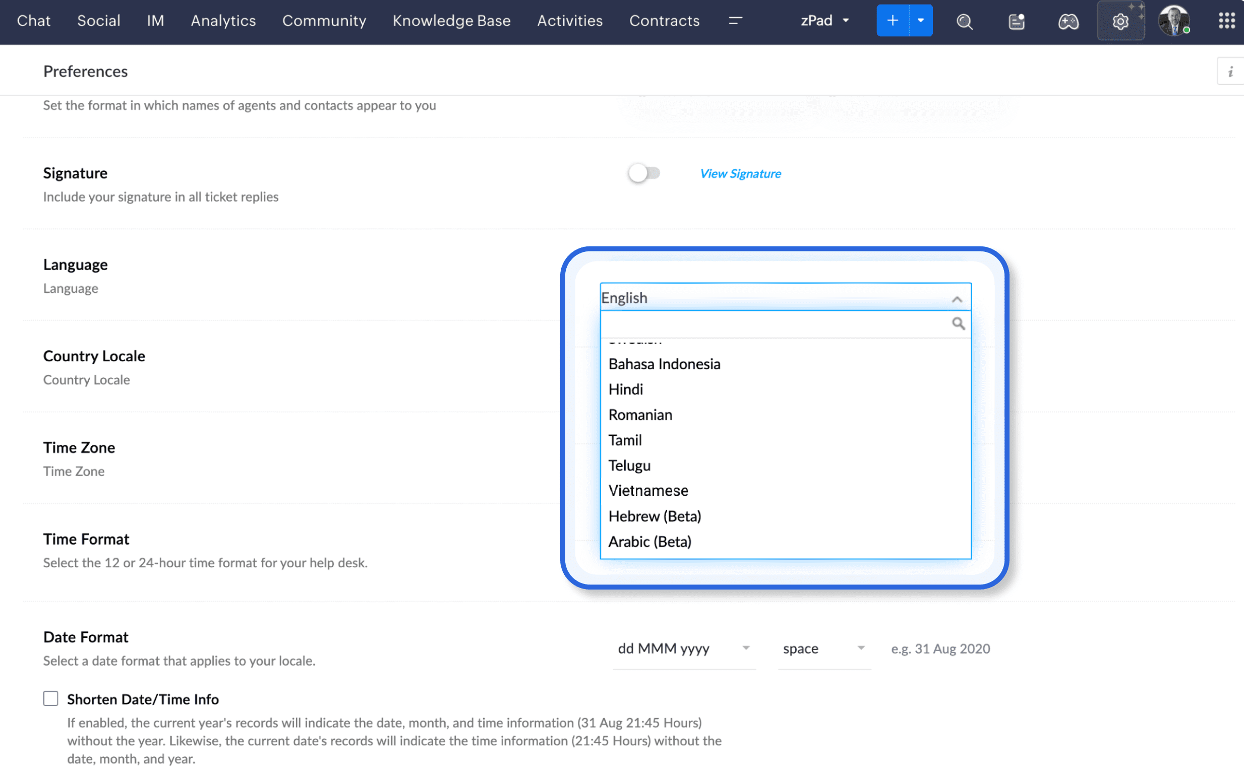 A interface do Zoho Desk agora está acessível em Vietnamita, Árabe, Hebraico e Coreano, juntamente com os 20 idiomas existentes. Estamos trabalhando consistentemente para suportar mais idiomas no Zoho Desk.