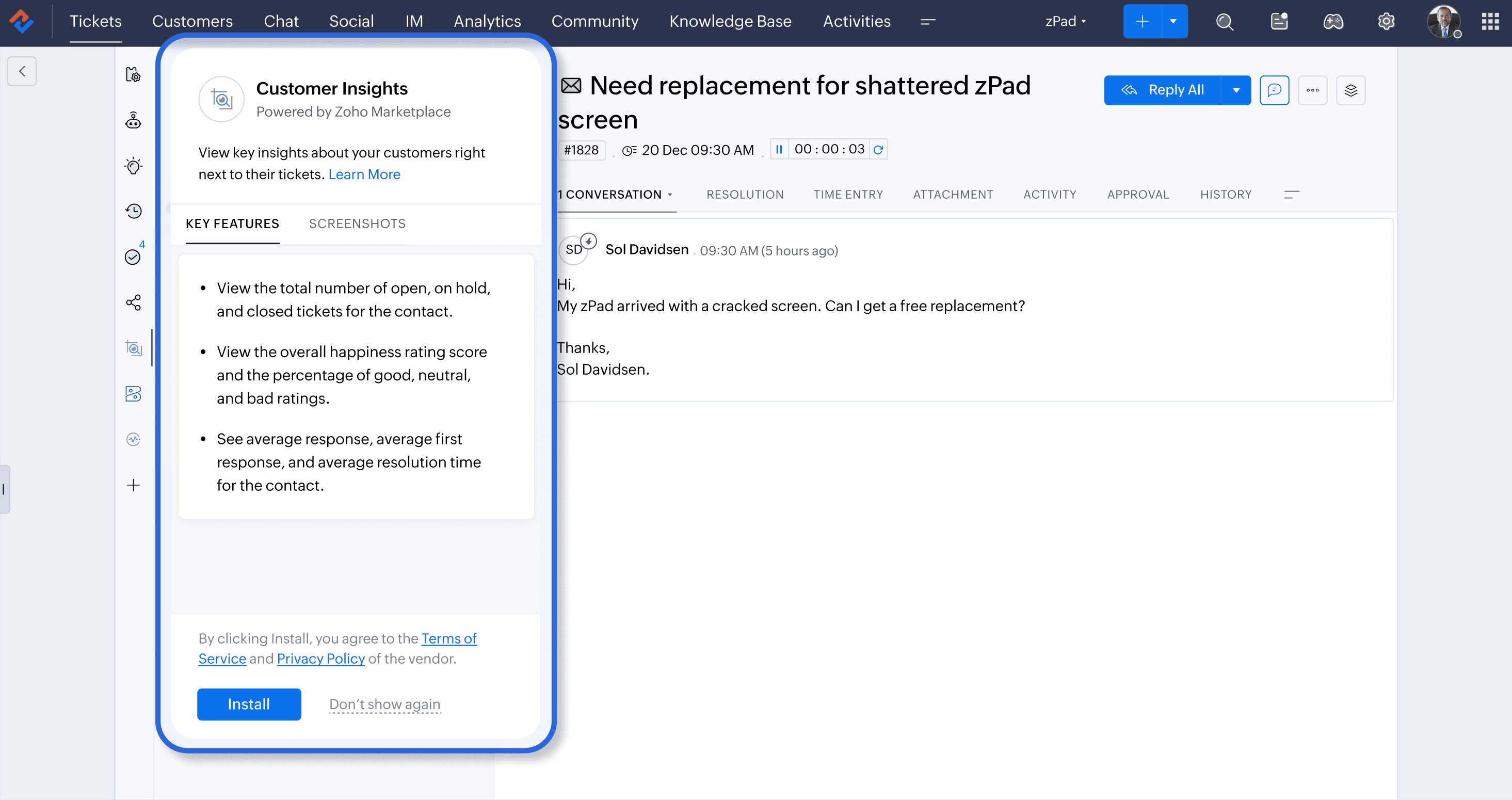 O pacote inicial de extensões do Zoho Desk melhora sua experiência no marketplace facilitando a descoberta de aplicativos úteis. Com maior flexibilidade na instalação e gerenciamento de extensões, o novo ícone de integração ao marketplace diretamente na página de detalhes dos tickets ajuda você a explorar onde as extensões podem ser exibidas em vários espaços reservados do Zoho Desk. Ele lista os aplicativos de produtividade mais instalados desenvolvidos pelo Zoho Desk, mostrando como eles podem otimizar suas operações atuais e também destaca oportunidades para integrações de terceiros e a criação de suas próprias extensões.