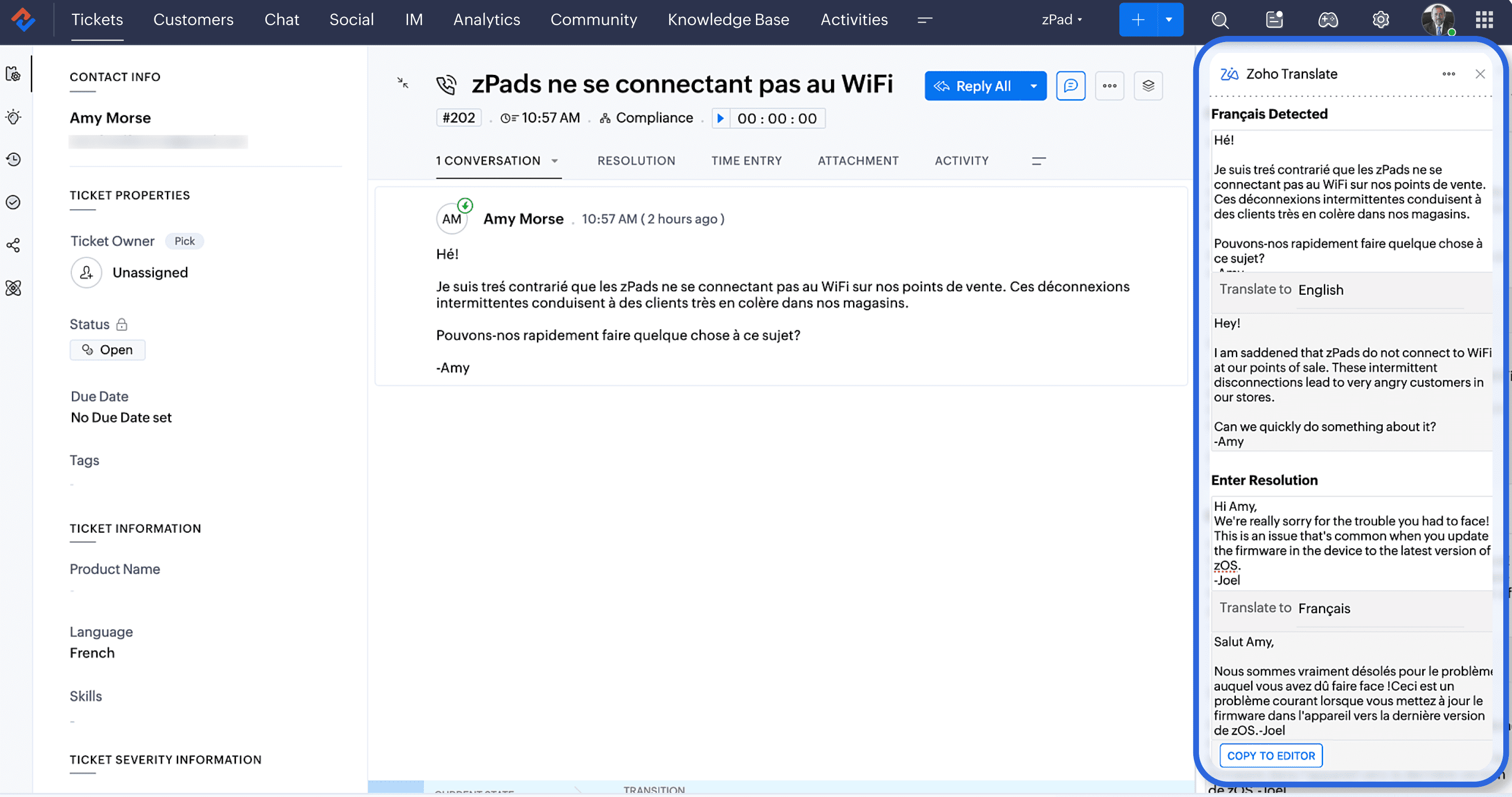 O Zoho Translate, uma poderosa extensão do Zoho Desk, elimina a barreira do idioma entre clientes e agentes de suporte. Muitas vezes, os clientes enviam tickets em seu idioma preferido, e os agentes nem sempre os entendem. O Zoho Translate capacita os agentes a traduzir tickets de forma transparente para os idiomas com os quais estão familiarizados, diretamente na tela do ticket. Os agentes também podem compor respostas em seu idioma preferido, e o Zoho Translate ajuda a traduzi-las para o idioma do cliente, garantindo uma comunicação eficaz.
