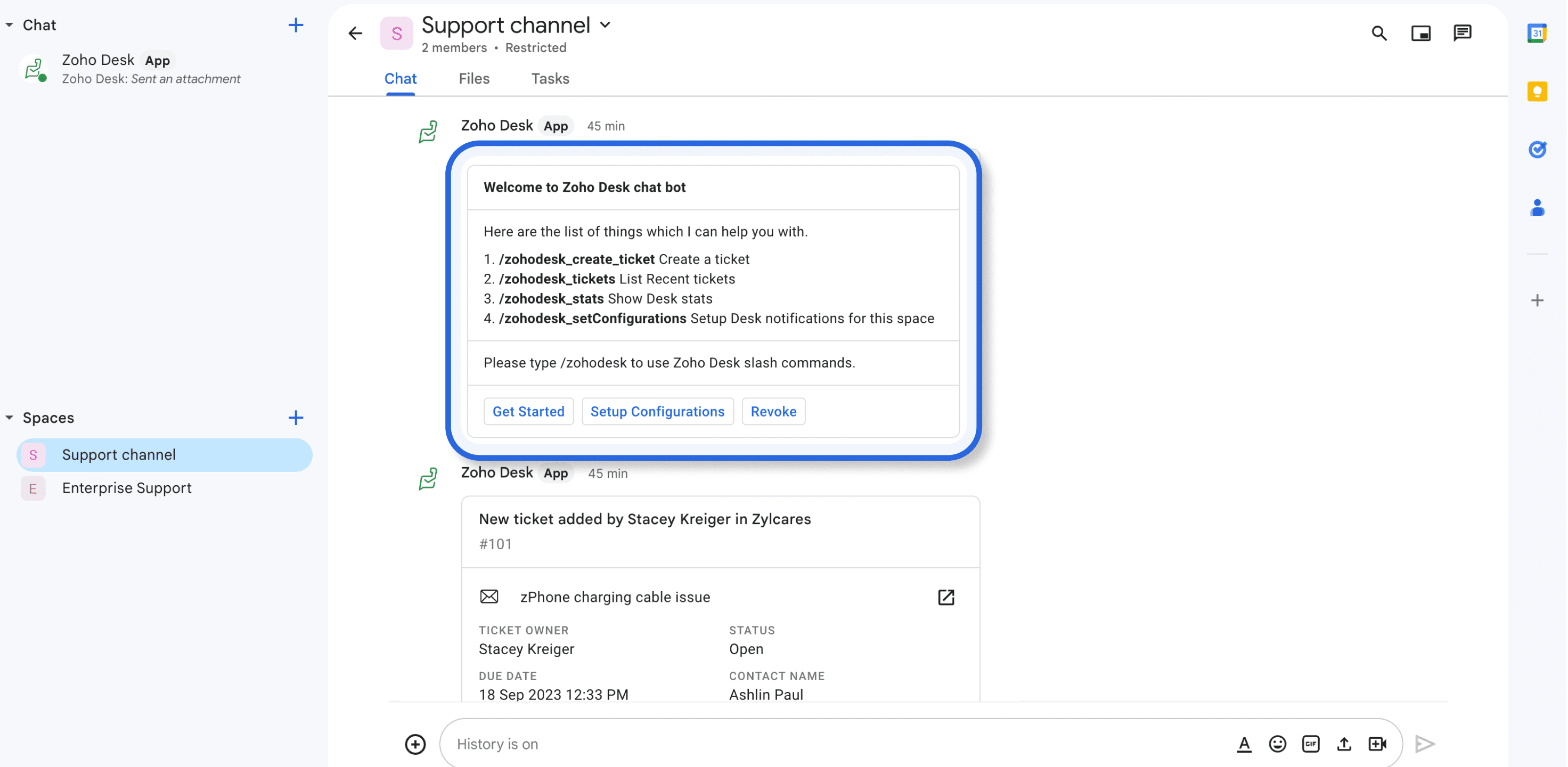 O Zoho Desk agora se integra ao Google Chat, aumentando a colaboração e a eficiência do suporte. Essa sinergia capacita os agentes a gerenciar tickets de forma transparente, desde a criação até a resolução, sem alternar entre plataformas. Por exemplo, dentro do Google Chat, os agentes podem realizar várias ações de ticket, como visualizar, criar, atribuir, comentar, responder, atualizar status e rastrear métricas importantes simplesmente usando comandos.