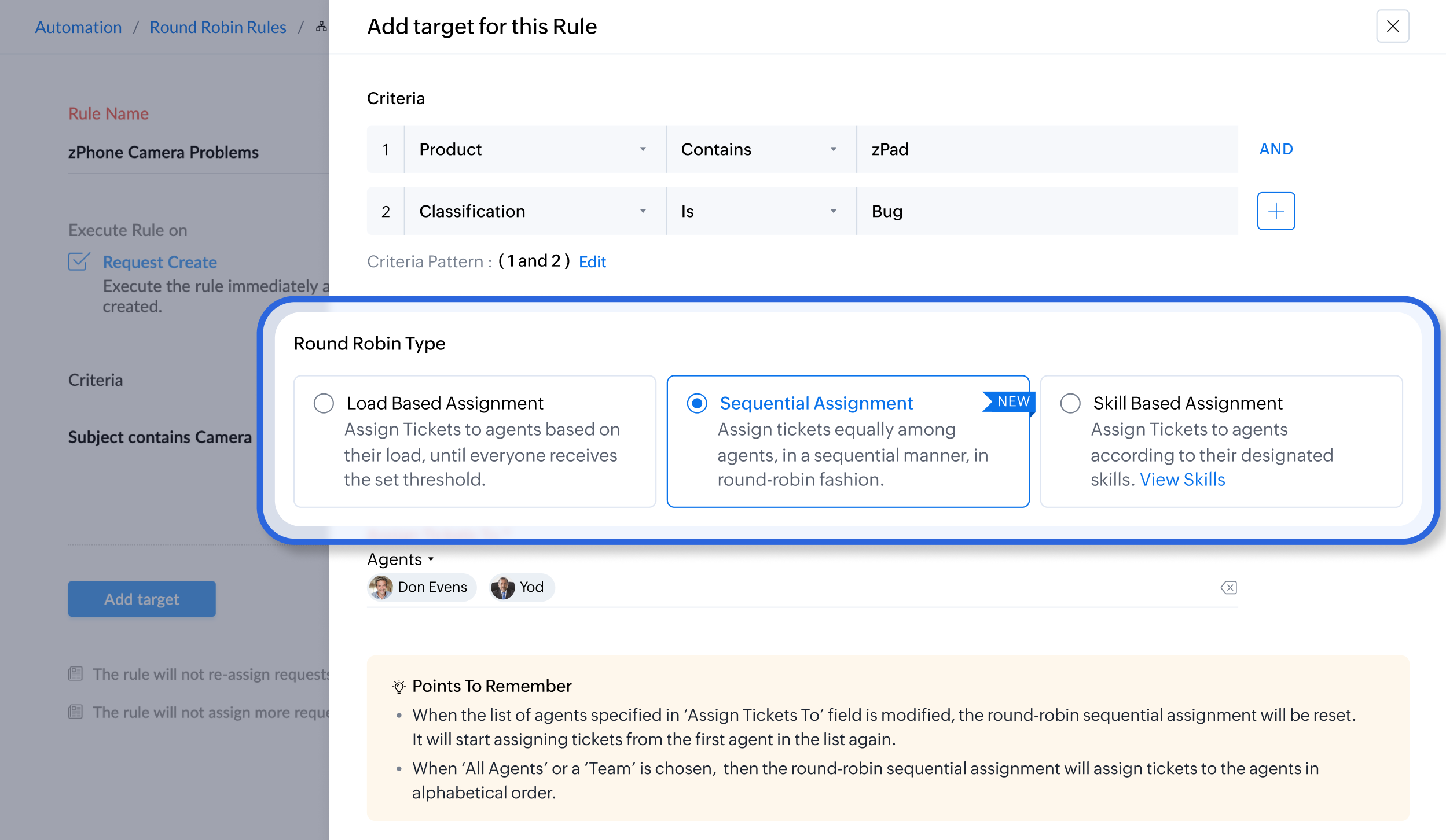 A configuração da regra e os agentes selecionados durante a configuração determinam a sequência em que os agentes recebem os tickets. Por exemplo, se Holly, Mike e Ali forem adicionados nessa ordem, Holly recebe o primeiro ticket, seguido por Mike e depois Ali. Alternativamente, se você selecionar 'todos os agentes' ou 'uma equipe', os tickets são atribuídos em ordem alfabética aos agentes - Ali, Holly, Mike. Essa abordagem evita sobrecarregar agentes individuais, mantém um fluxo de trabalho tranquilo e otimiza as cargas de trabalho dos agentes.