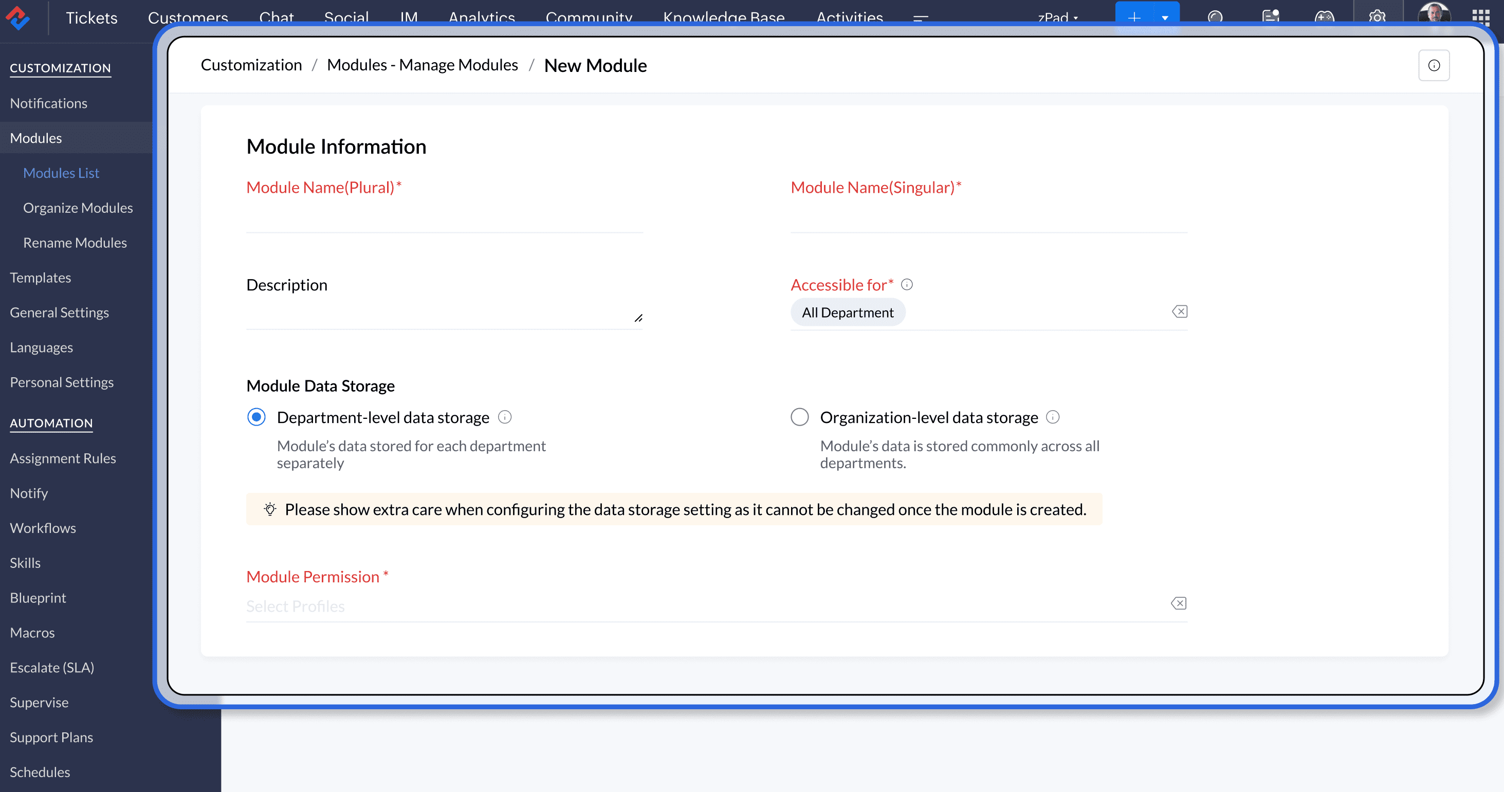 Seu software de atendimento ao cliente deve refletir a flexibilidade e o dinamismo de seus negócios, e com módulos personalizados, o Zoho Desk alcança exatamente isso. Os módulos personalizados permitem que você capture dados de maneira que faça sentido para seus negócios e acomode informações que não se encaixam perfeitamente nos módulos padrão do Zoho Desk. Você pode criar vários módulos adaptados aos seus processos específicos, atribuir nomes conforme necessário e personalizar facilmente os nomes dos campos por meio de uma interface simples de arrastar e soltar.