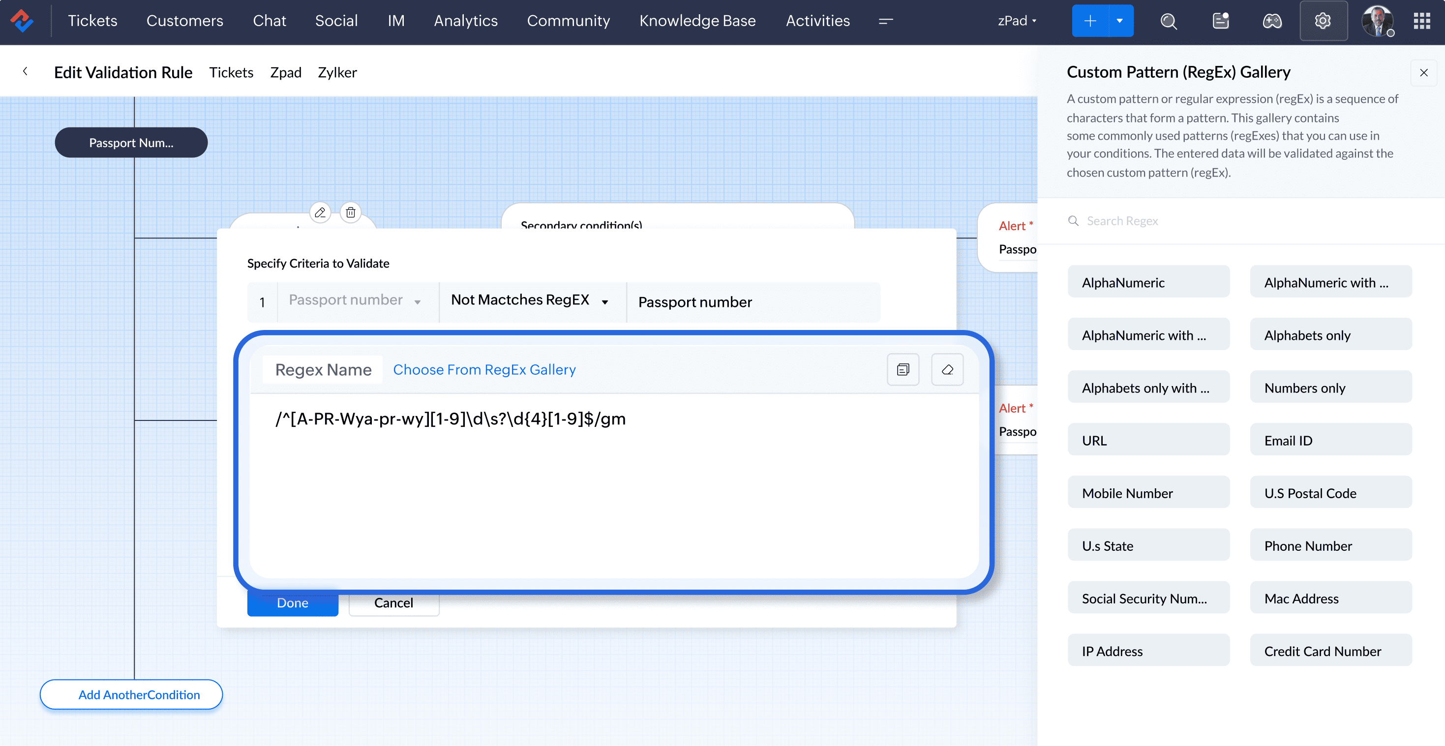 Você pode criar padrões de RegEx personalizados ou escolher em nossa galeria. Isso garante precisão e consistência dos dados dentro do Zoho Desk, ajudando a melhorar a usabilidade do sistema.