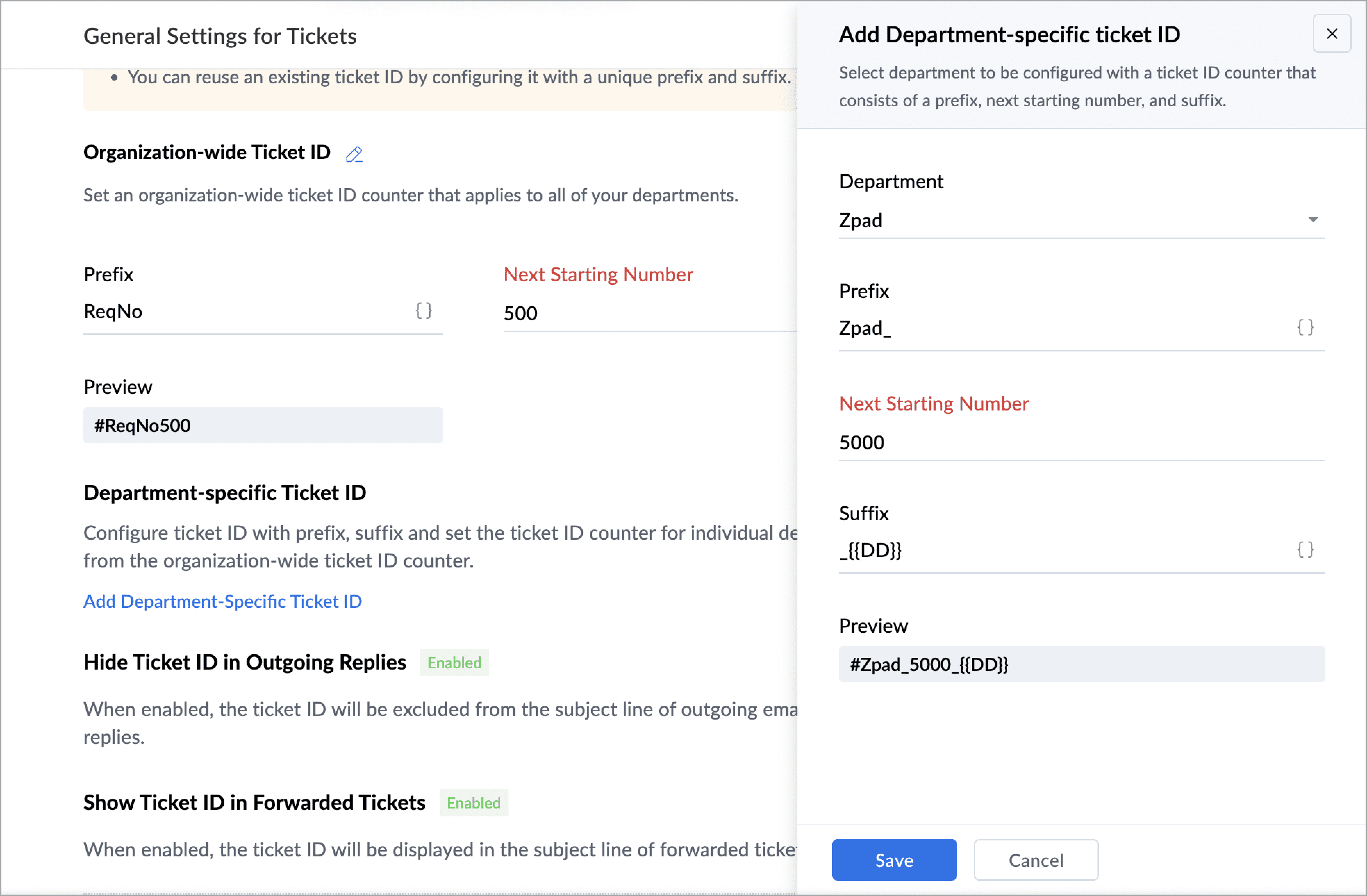 Agora, com a capacidade de personalizar IDs de ticket, você pode definir seu próprio formato alfanumérico para a identificação do ticket e ir além da numeração sequencial padrão. Especifique o prefixo e o sufixo do ID do ticket escolhendo componentes como data de vencimento do ticket, nível de prioridade, canal, categoria e muito mais. Você também pode criar componentes personalizados. Essa flexibilidade permite que as organizações gerem IDs de ticket significativos e alinhados com seus processos existentes.